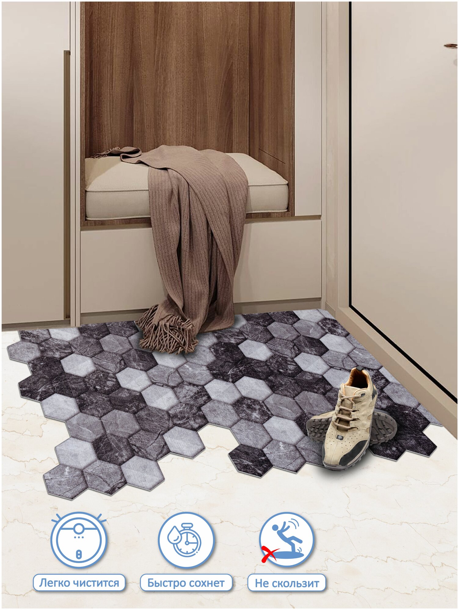 Оформите входную зону практично и стильно! Влаговпитывающий придверный коврик SHAHINTEX DIGITAL PRINT - уникальный продукт, с ним Ваше жилое пространство будет в чистоте и тренде! Коврик из 100% полиэстера на ПВХ-основе защищает от грязи, снега, песка и пыли. Отлично впитывает влагу, не портит напольное покрытие, прост в уходе. А ещё наш коврик - прекрасный способ самовыражения! Используйте ножницы, чтобы вырезать его под свой дверной проём и придать ему желаемую форму. Фантазируйте!