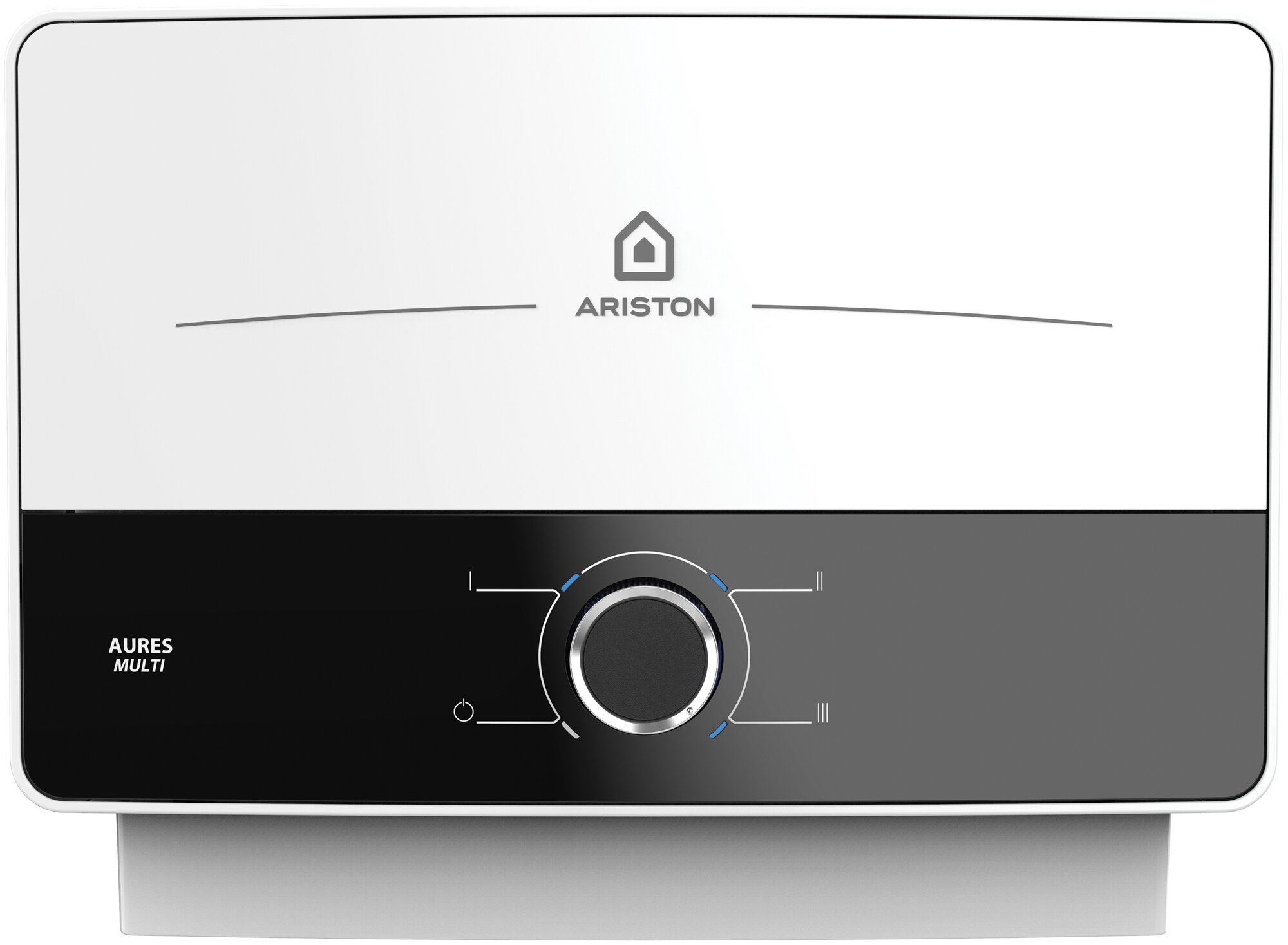 **Водонагреватель проточный Ariston Aures M** предназначен для установки в ванной или душе. Модель проточного типа, обладает компактными размерами, прямоугольным пластиковым корпусом. Водонагреватель оснащен механической системой управления и тремя режимами нагрева, что обеспечивает постоянный поток теплой воды. Предельная температура нагрева составляет 55°C. Такое устройство актуально в качестве дополнительного водонагревателя в квартире в период отключения горячей воды или постоянного — на даче.