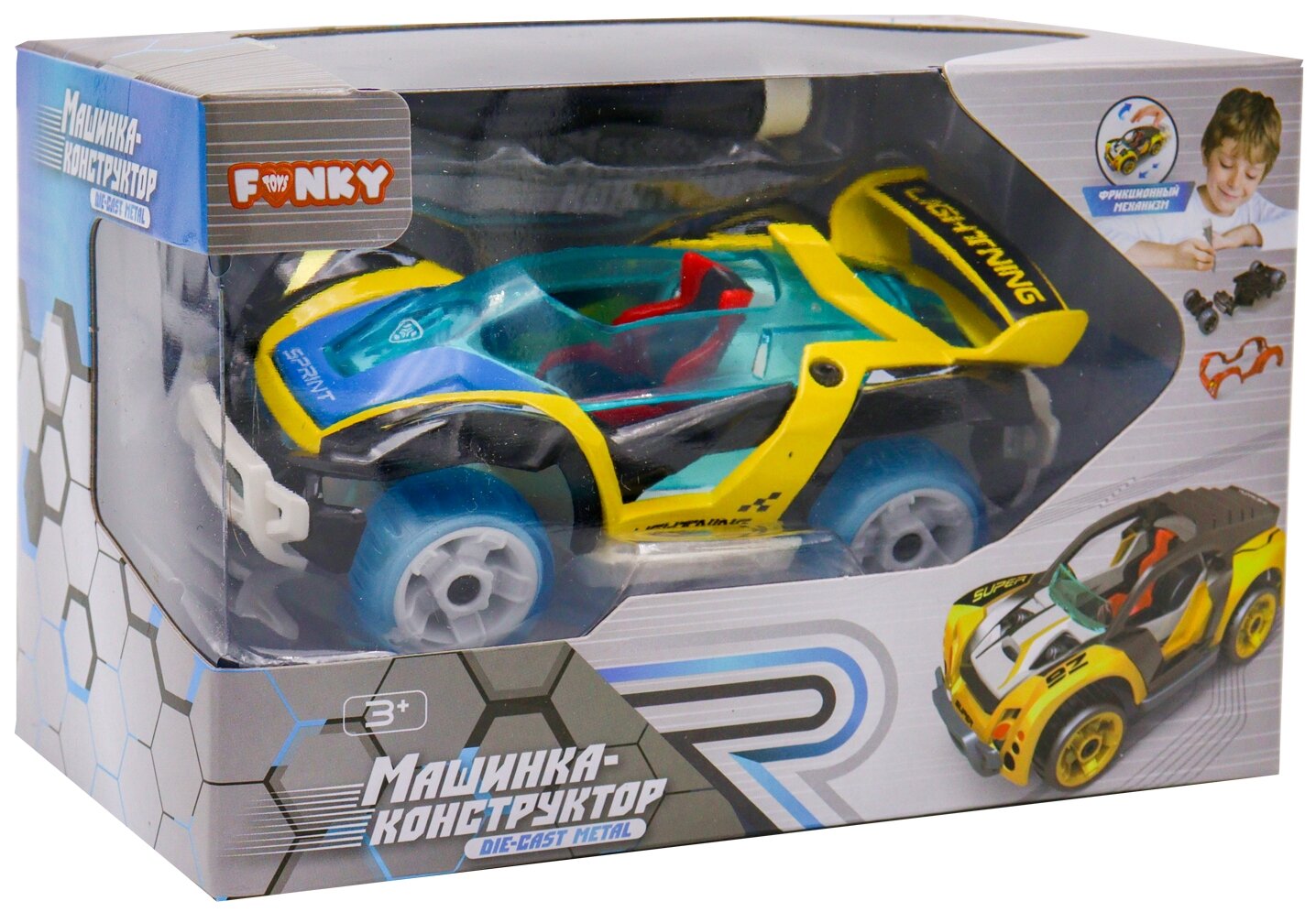 Детская фрикционная металлическая машинка конструктор от Funky Toys отлично развивает моторику рук ребенка. Благодаря встроенному механизму, машинка может легко передвигаться самостоятельно, для этого достаточно потянуть ее назад.