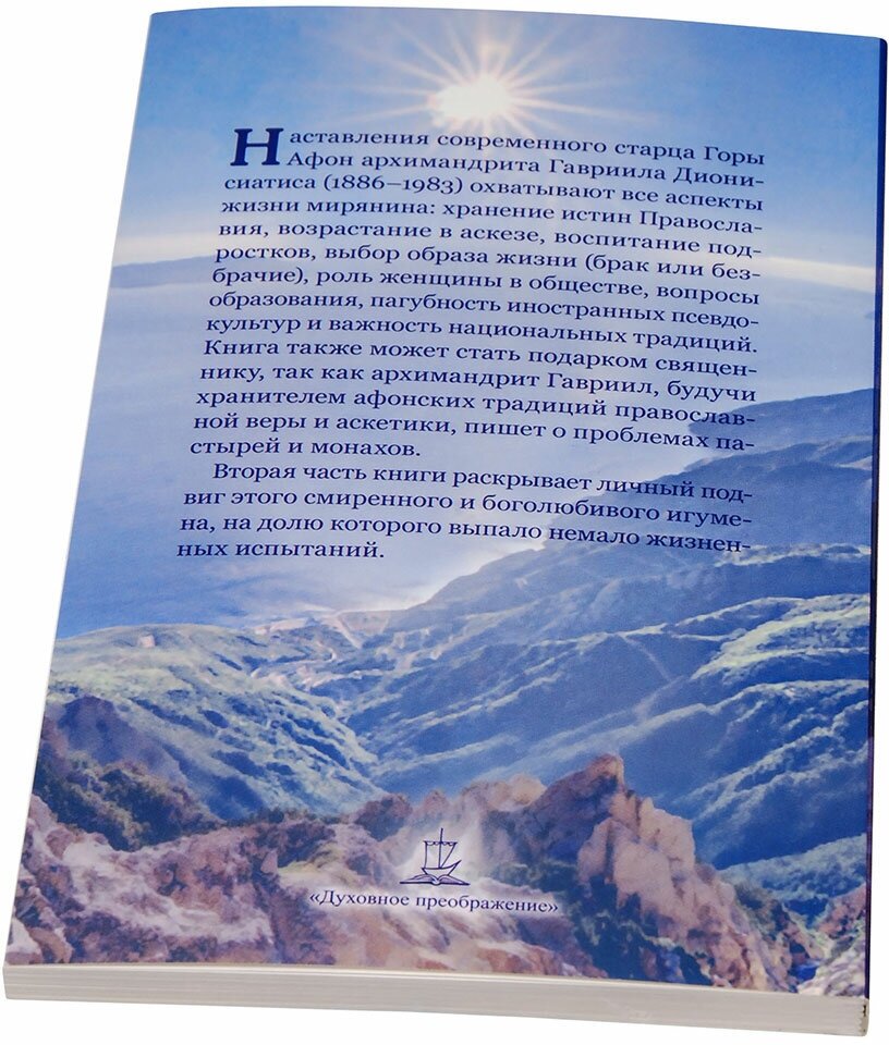 Наставления старца Горы Афон архимандрита Гавриила Дионисиатского (1886-1983) охватывают все аспекты жизни мирянина: хранение истин Православия, возрастание в аскезе, воспитание подростков, выбор образа жизни (брак или безбрачие), роль женщины в обществе, вопросы образования, пагубность иностранных псевдокультур и важность национальных традиций. Книга также может стать подарком священнику, так как архимандрит Гавриил, будучи хранителем афонских традиций православной веры и аскетики, со смирением и любовью пишет о проблемах пастырей и монахов. Вторая часть книги раскрывает личный подвиг этого смиренного и боголюбивого игумена, на долю которого выпало немало жизненных испытаний.