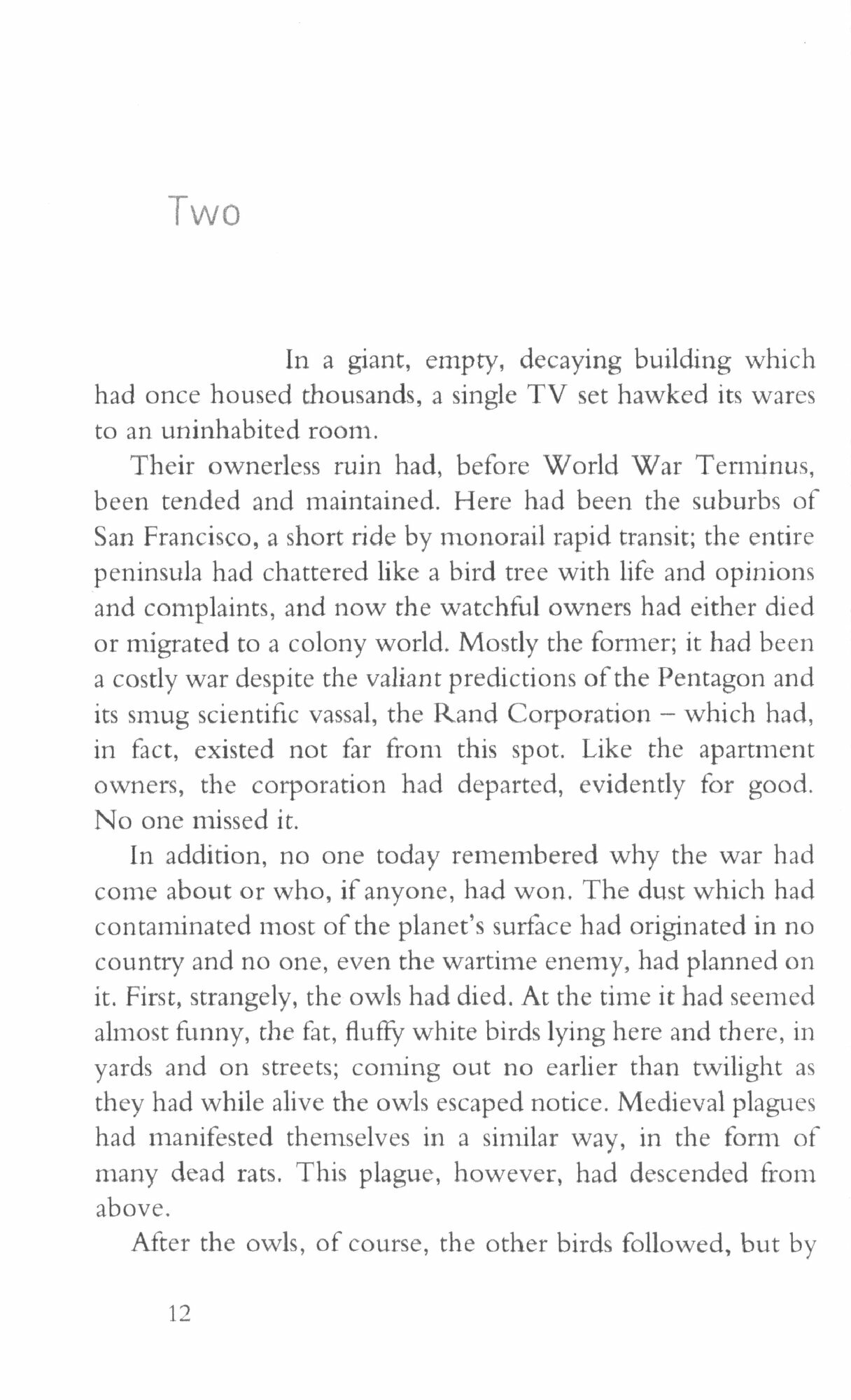 World War Terminus devastated the Earth. Through its ruins, bounty hunter Rick Deckard searches for the renegade replicants he is sent to 'retire', while he dreams of owning a live animal - the ultimate status symbol in a world all but bereft of natural life.