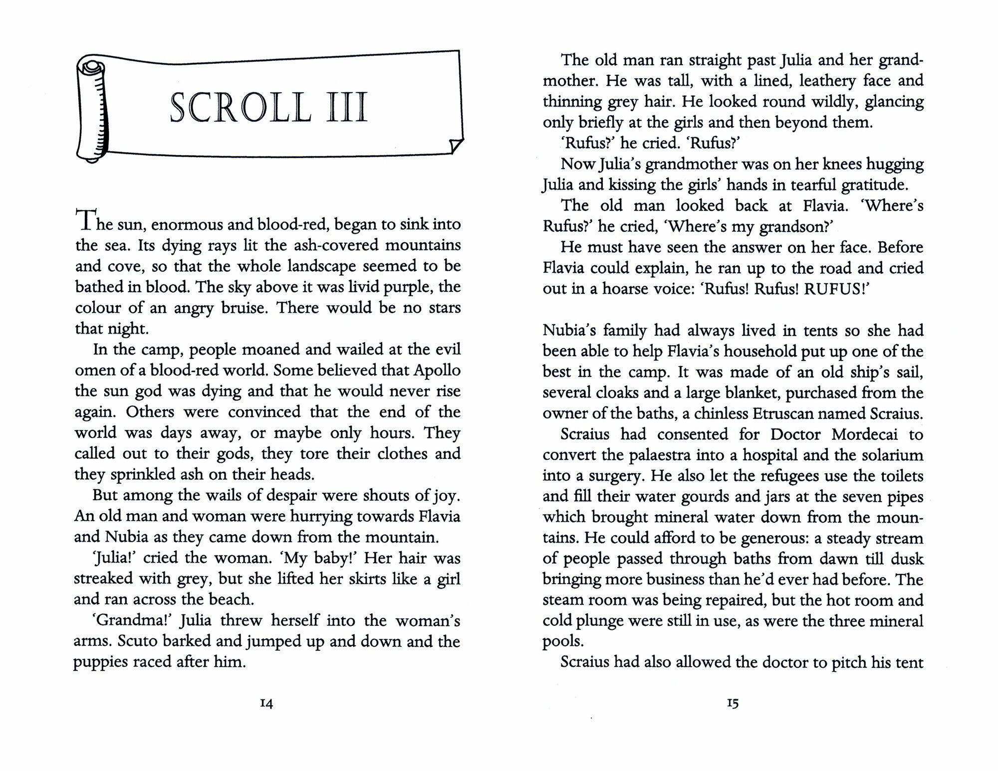 AD 79, following the eruption of Mount Vesuvius and the destruction of Pompeii. Among the thousands of people huddled in refugee camps along the bay of Naples are Flavia Gemina and her friends Jonathan the Jewish boy, Nubia the African slave-girl, and Lupus the mute beggar boy. Their discovery that children are being kidnapped from the camps- among them the daughter of the powerful Publius Pollius Felix- leads them to solve the mystery of the pirates of Pompeii. A terrifically exciting and dramatic story and a brilliant picture of the aftermath of a great disaster.