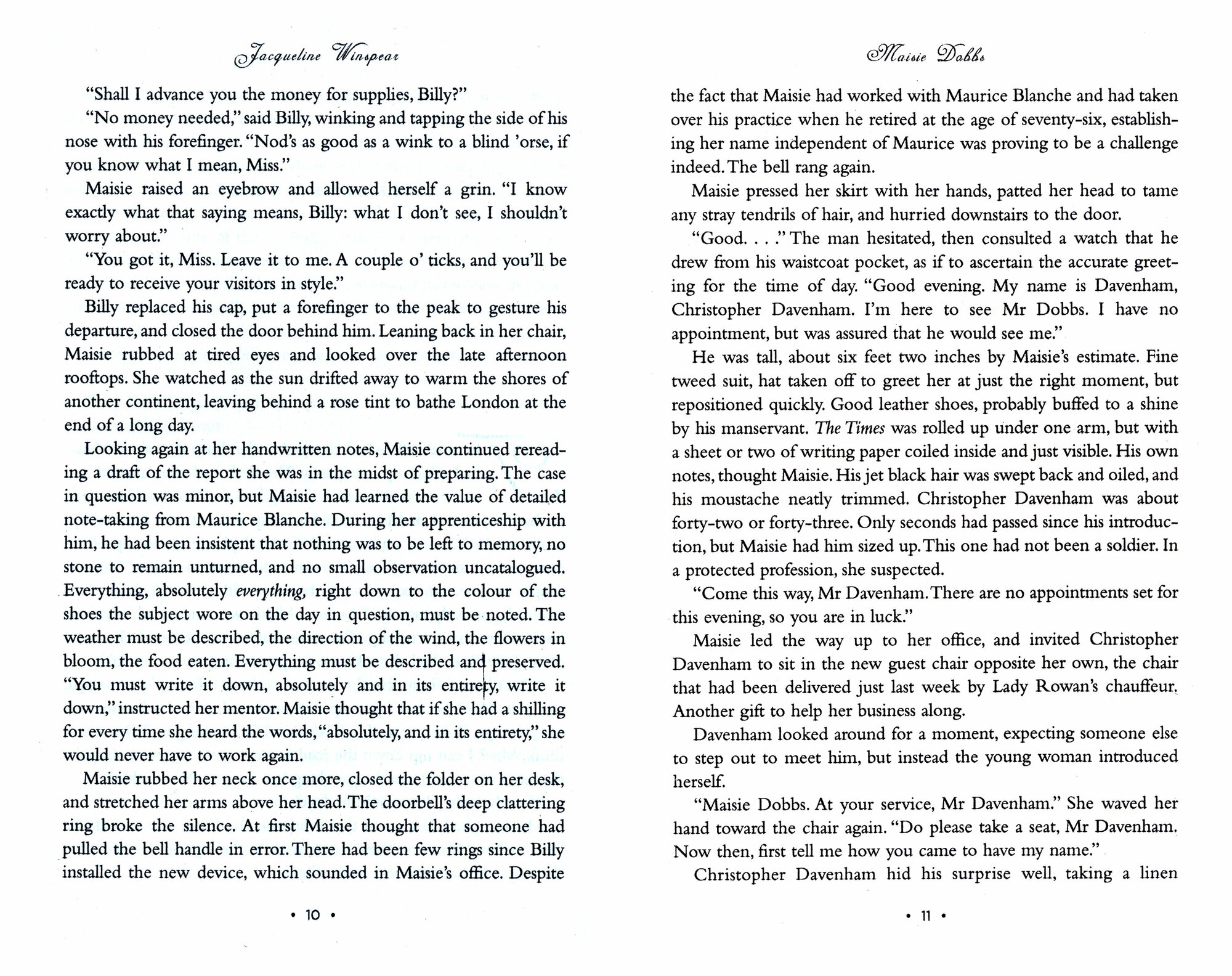 Having started as a maid to the London aristocracy, studied her way to Cambridge and served as a nurse in the Great War, Maisie has wisdom, experience and understanding beyond her years. Little does she realise the extent to which this strength of character is soon to be tested. For her first case forces her to uncover secrets long buried, and to confront ghosts from her own past