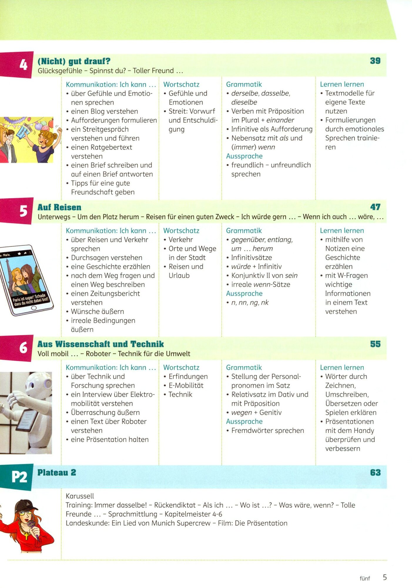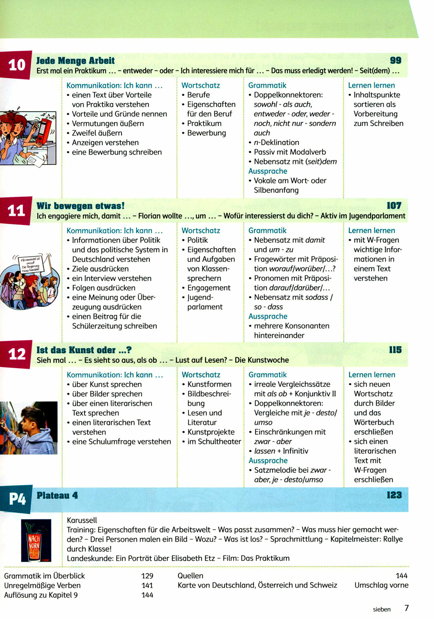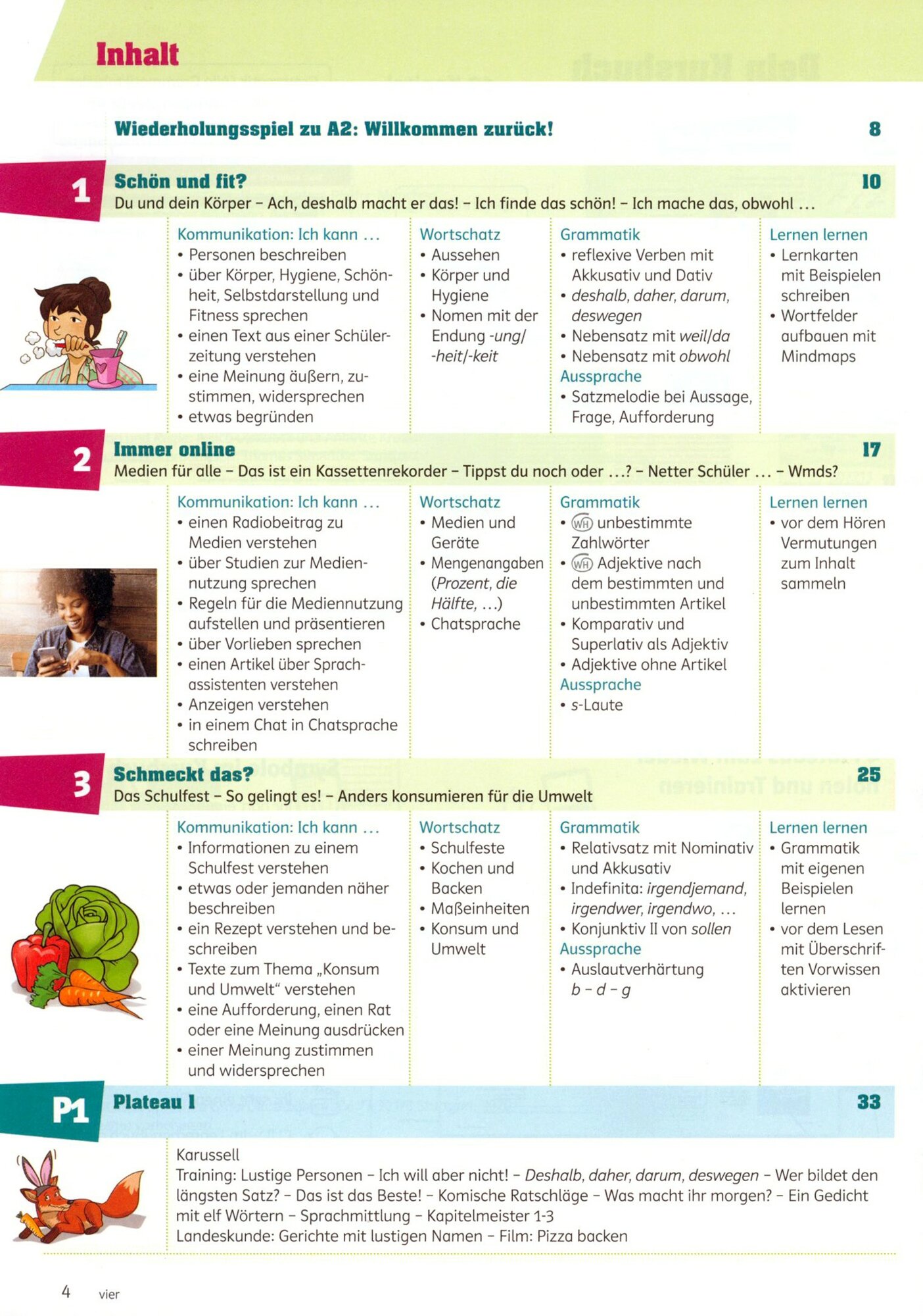 Ruckschauseiten mit Ubersichten zu Wortschatz, Redemitteln, Grammatik und Moglichkeit zur Selbstevaluation