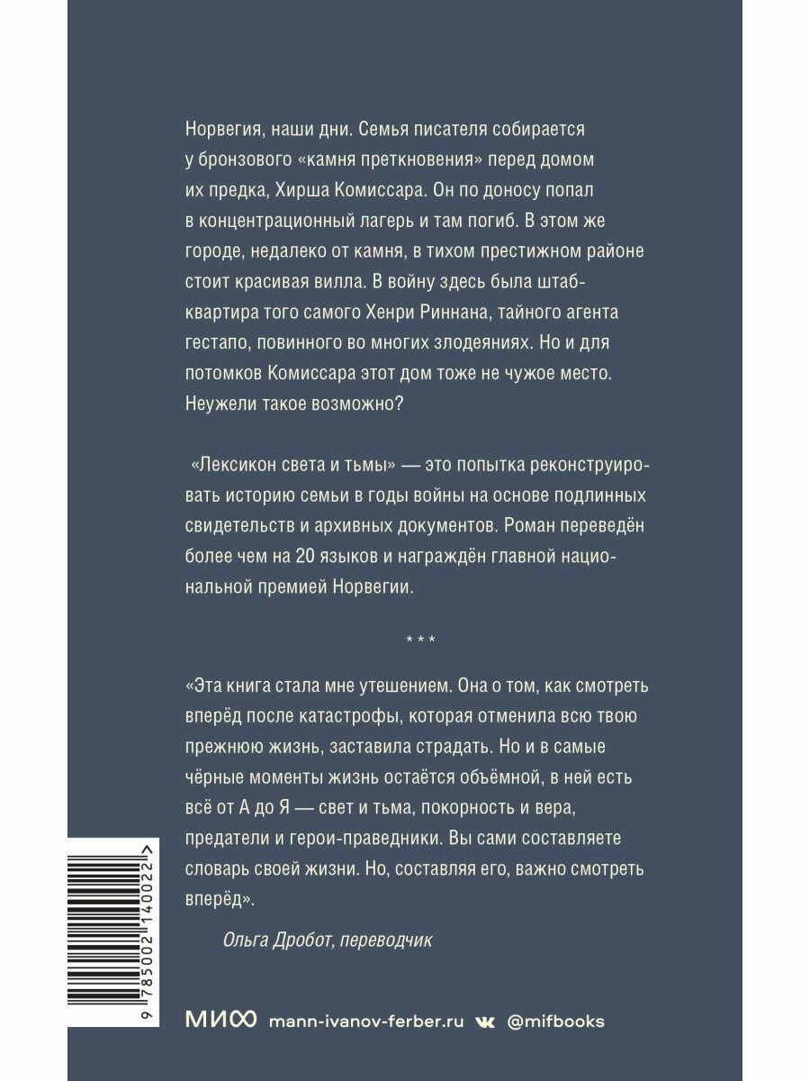 "Лексикон света и тьмы" — попытка реконструировать историю семьи в годы войны на основе подлинных свидетельств и архивных документов. Роман переведен более чем на 20 языков и награжден главной национальной премией Норвегии.
