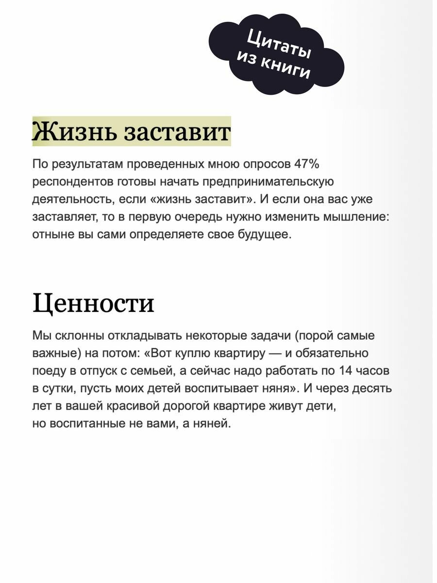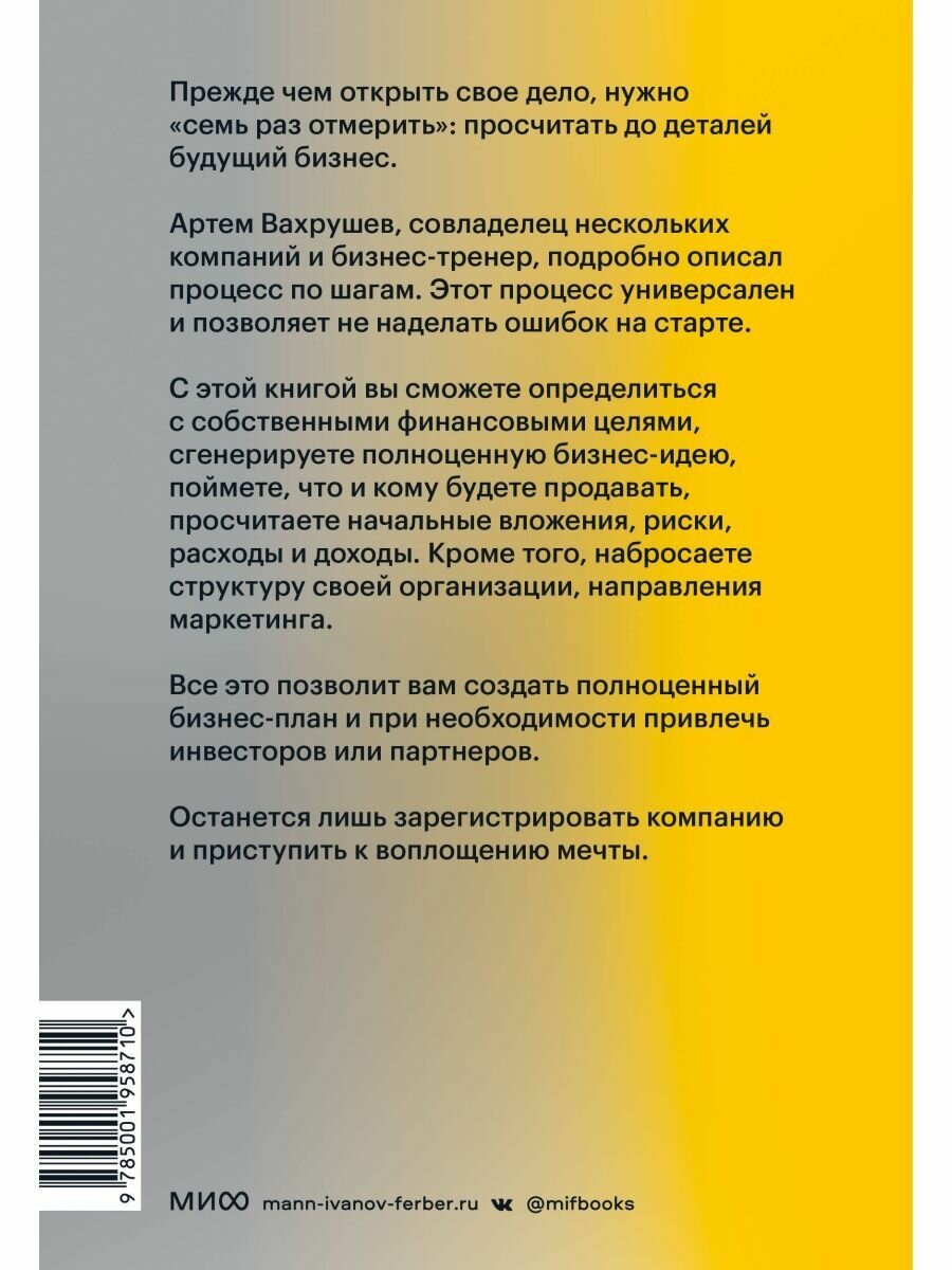 С этой книгой вы сможете определиться с собственными финансовыми целями, сгенерируете полноценную бизнес-идею, поймете, что и кому будете продавать, просчитаете начальные вложения, риски, расходы и доходы. Кроме того, набросаете структуру своей организации, направления маркетинга. Все это позволит вам создать полноценный бизнес-план и при необходимости привлечь инвесторов или партнеров.