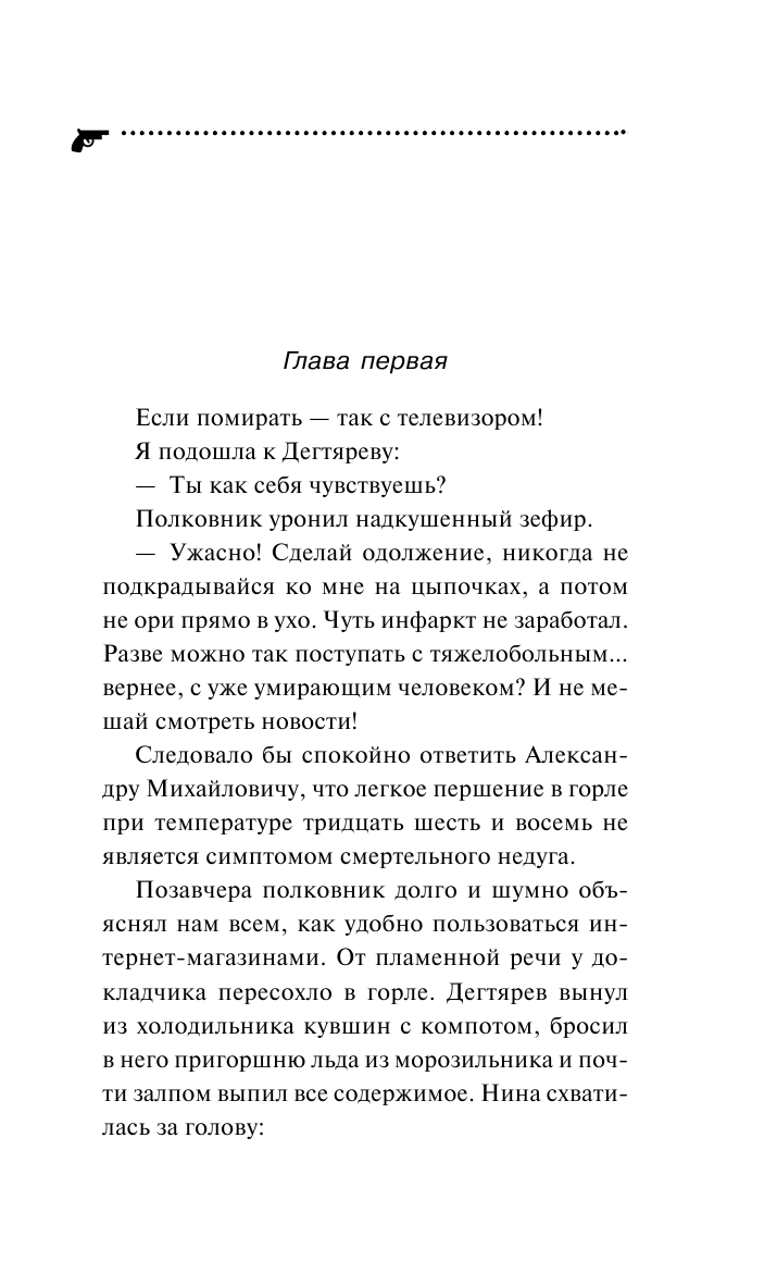 Если помирать - так с телевизором! Я подошла к Дегтяреву. - Ты как себя чувствуешь? Полковник уронил надкушенный зефир. - Ужасно! Сделай одолжение, никогда не подкрадывайся ко мне на цыпочках, а потом не ори прямо в ухо. Чуть инфаркт не заработал. Разве можно так поступать с тяжело больным… вернее, с уже умирающим человеком? И не мешай смотреть новости!