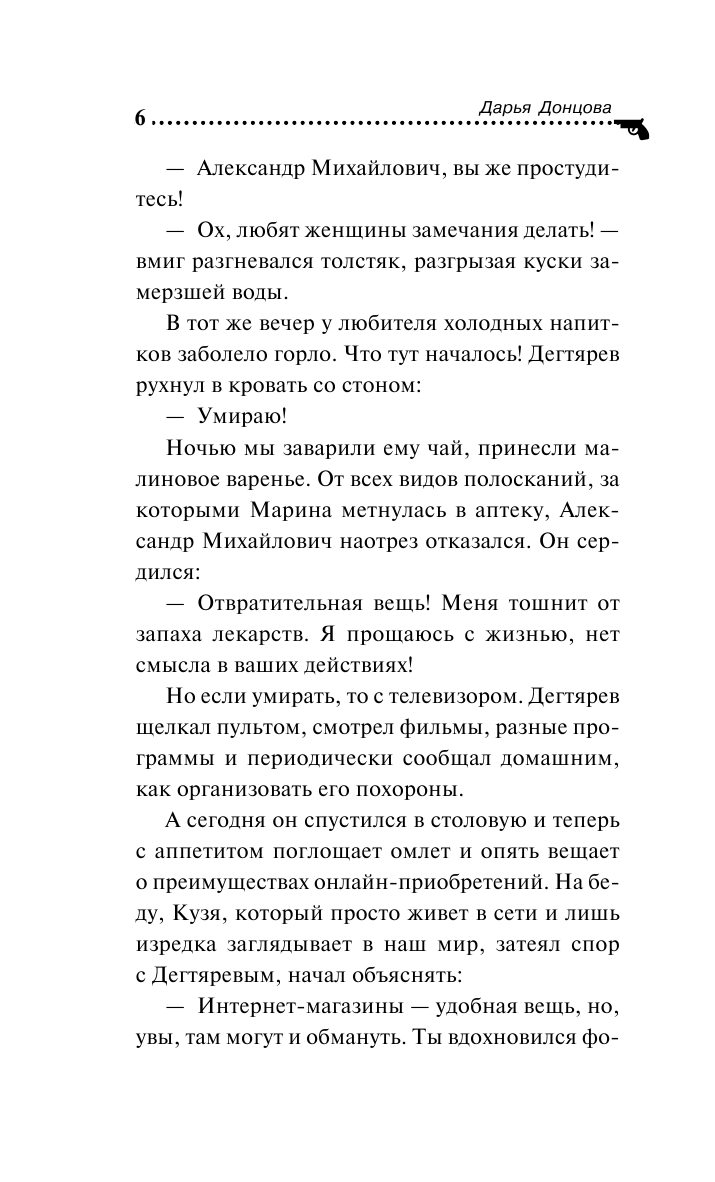 Если помирать — так с телевизором! Полковник Дегтярев мужественно переносил боль в горле и температуру тридцать шесть и восемь, лежа в постели и щелкая пультом. Но как следует поболеть ему не довелось. В офис его агентства «Тюх» обратился богатый бизнесмен Филипп Марин. Он сообщил, что его жена Флора утонула полтора месяца назад. Филипп обезумел от горя, а недавно в ресторане увидел свою сводную сестру Анну с любимой сумкой Флоры. А ведь эта сумка, сделанная на заказ, существует в единственном экземпляре… Как она могла оказаться у Анны? Филипп просит сыщиков поговорить с его сестрой и узнать, откуда у нее эта вещь. Тем более что все остальные драгоценности покойной на месте А вдруг это как-то связано с гибелью Флоры? Даша Васильева и Александр Дегтярев берутся за работу и выясняют, что все участники драмы не те, за кого себя выдают. И, более того — они даже не те, кем себя считают. Ну как тут не сойти с ума?!