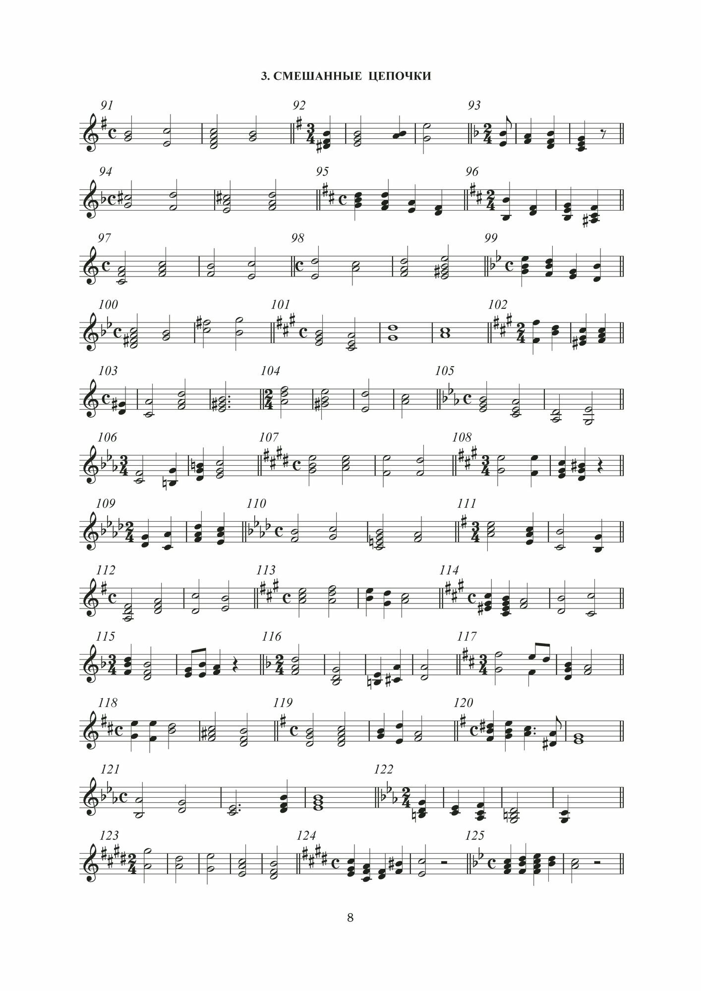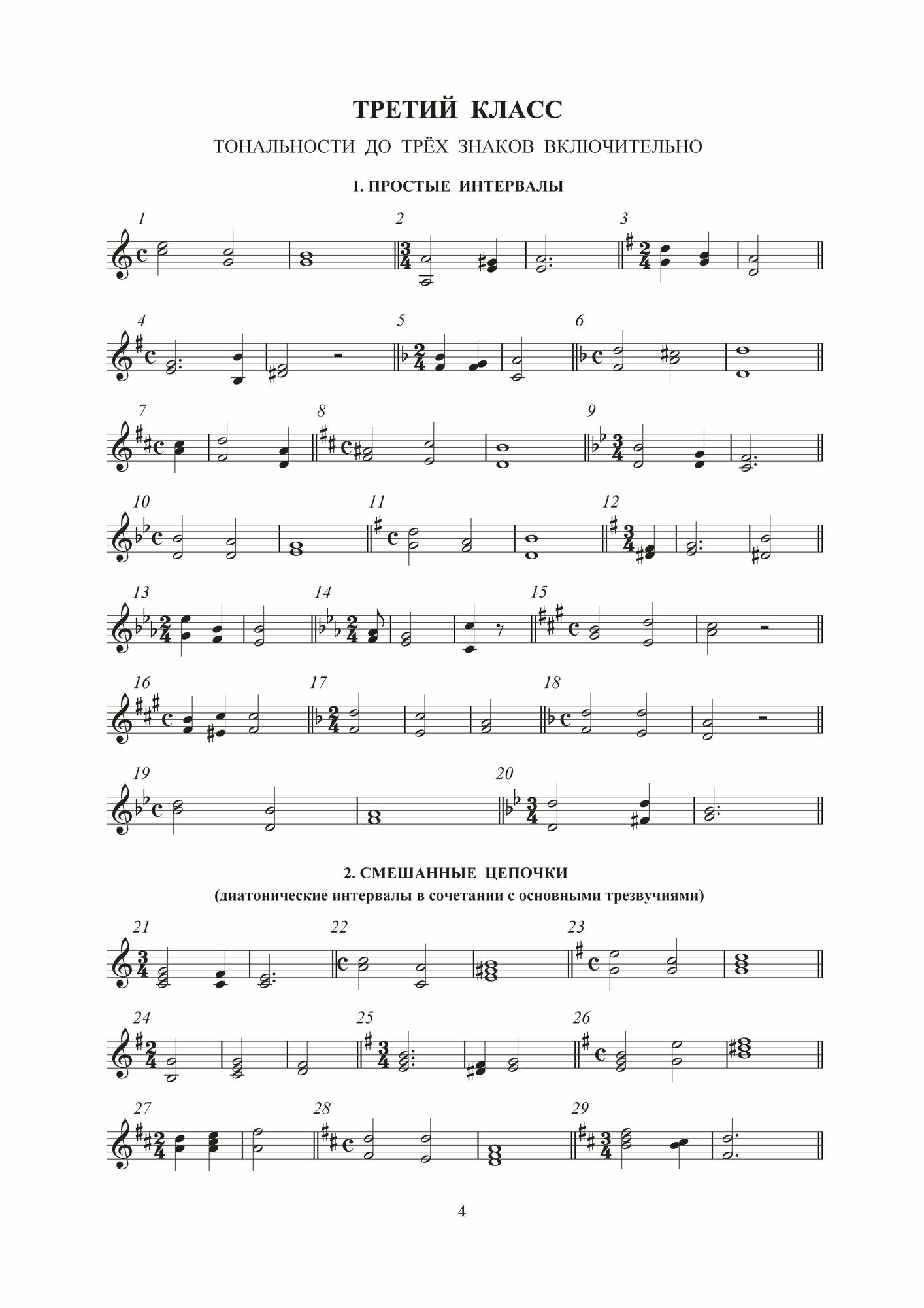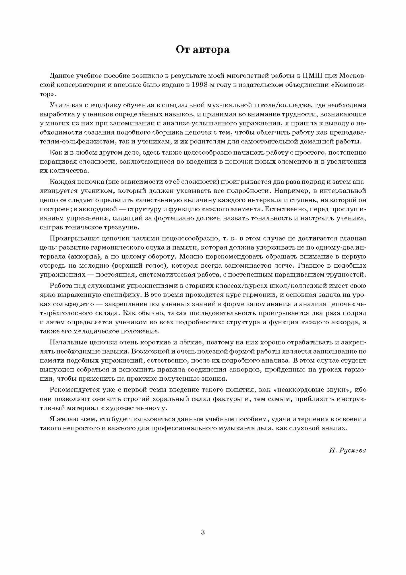 The textbook includes numerous chains: interval chains, chord chains, mixed and four-part chains, which were composed and tested by the author at solfeggio lessons in different classes at the Central Music School of the Moscow Conservatory. All material is divided into topics and levels, in accordance with the curriculum, and is arranged as it becomes more complicated — within each section.