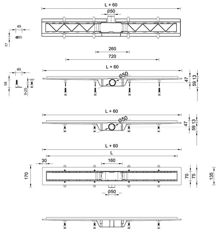 | ВКоробке | Душевой желоб - 1 шт. Решетка - 1 шт. Сифон - 1 шт. Комплект опор - 1 шт. Шарнирный отвод - 1 шт. Рамка с удлинителем - 1 шт. Защитная заглушка - 1 шт. Прокладка гидроизолирующая - 1 шт. Уплотнительная манжета - 1 шт. Инструкция - 1 шт. |