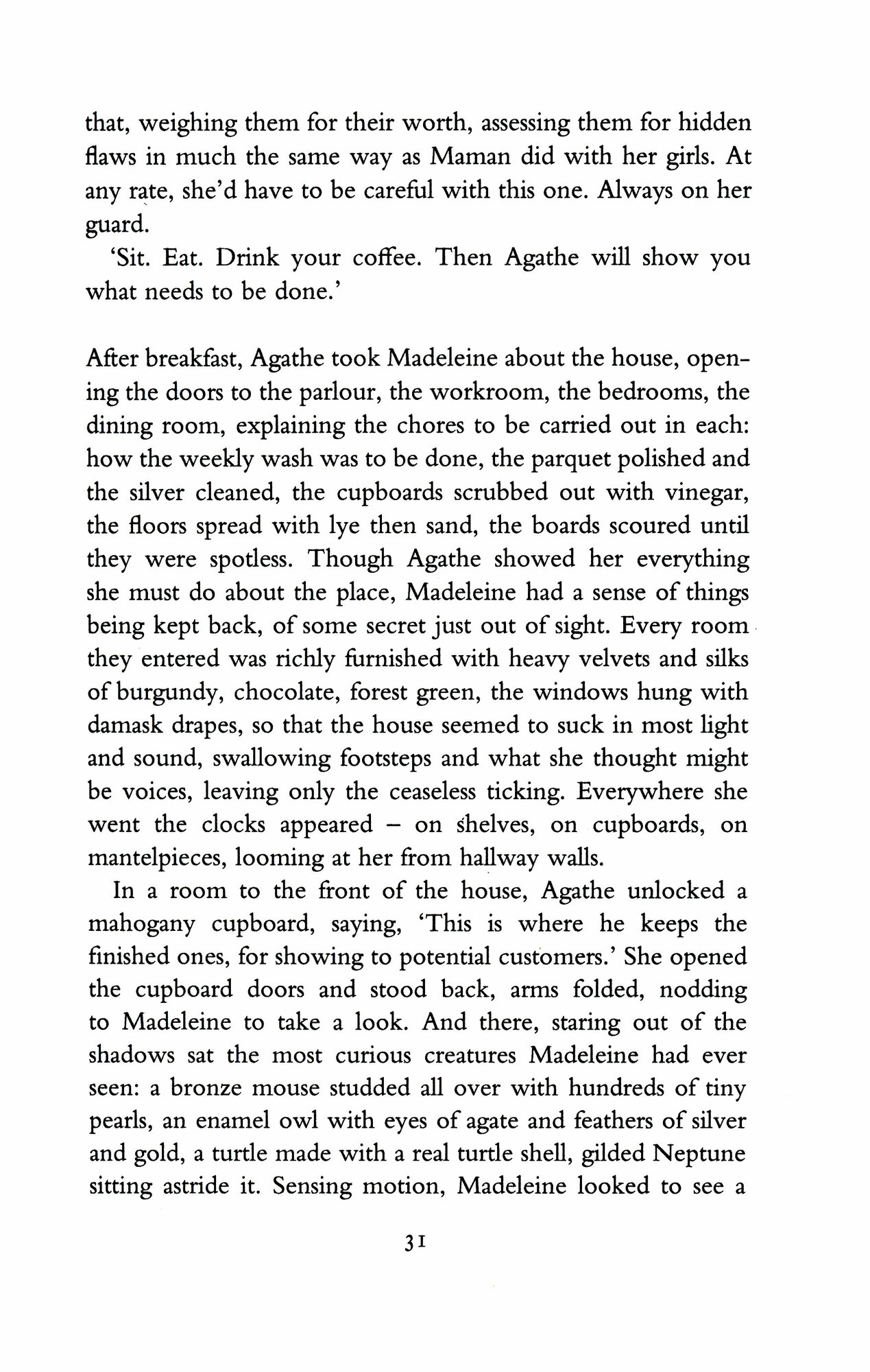 In the midst of an icy winter, as birds fall frozen from the sky, chambermaid Madeleine Chastel arrives at the home of the city's celebrated clockmaker and his clever, unworldly daughter.