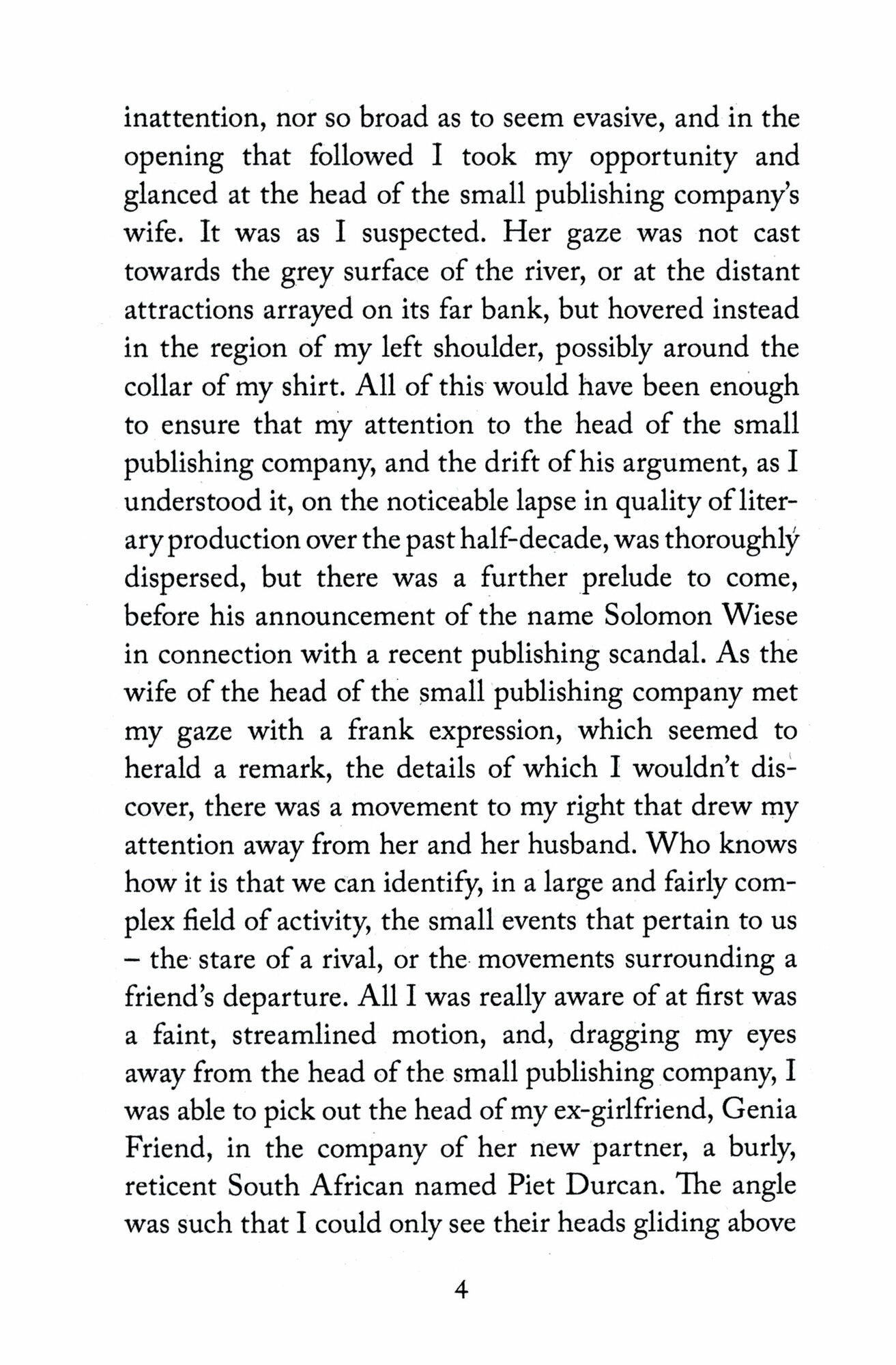 Wiese's story involves a plagiarism scandal, the death of an old poet, a love affair with a woman carrying a signpost, a retreat to the East Anglian countryside, and his plans for a triumphant return to the capital - plans in which our unnamed narrator discovers he is obscurely implicated ...