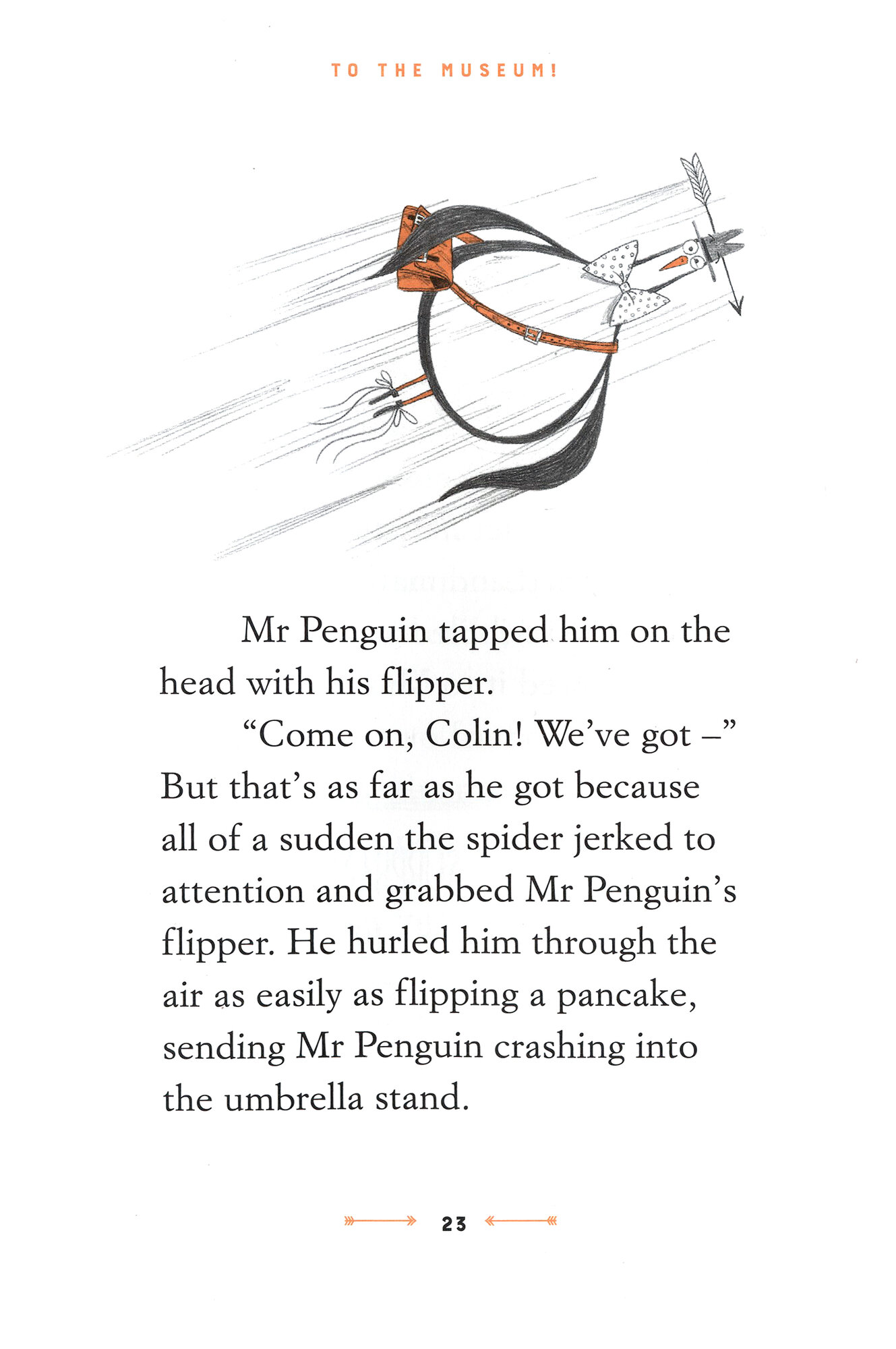 It has been weeks since Mr Penguin's last adventure and he's been stuck at his desk, twiddling his flippers ever since. That is until the phone rings! Mr Penguin and Colin (a spider and Mr Penguin's silent right hand man) are called in to find the missing treasure somewhere in the Museum of Extraordinary Objects. The quest finds them solving secret codes, fighting ferocious beasts, eating fish finger sandwiches and travelling deep below the museum to a lost jungle...