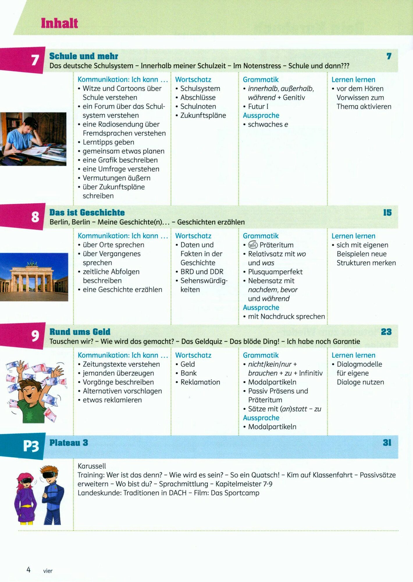 Ruckschauseiten mit Ubersichten zu Wortschatz, Redemitteln, Grammatik und Moglichkeit zur Selbstevaluation