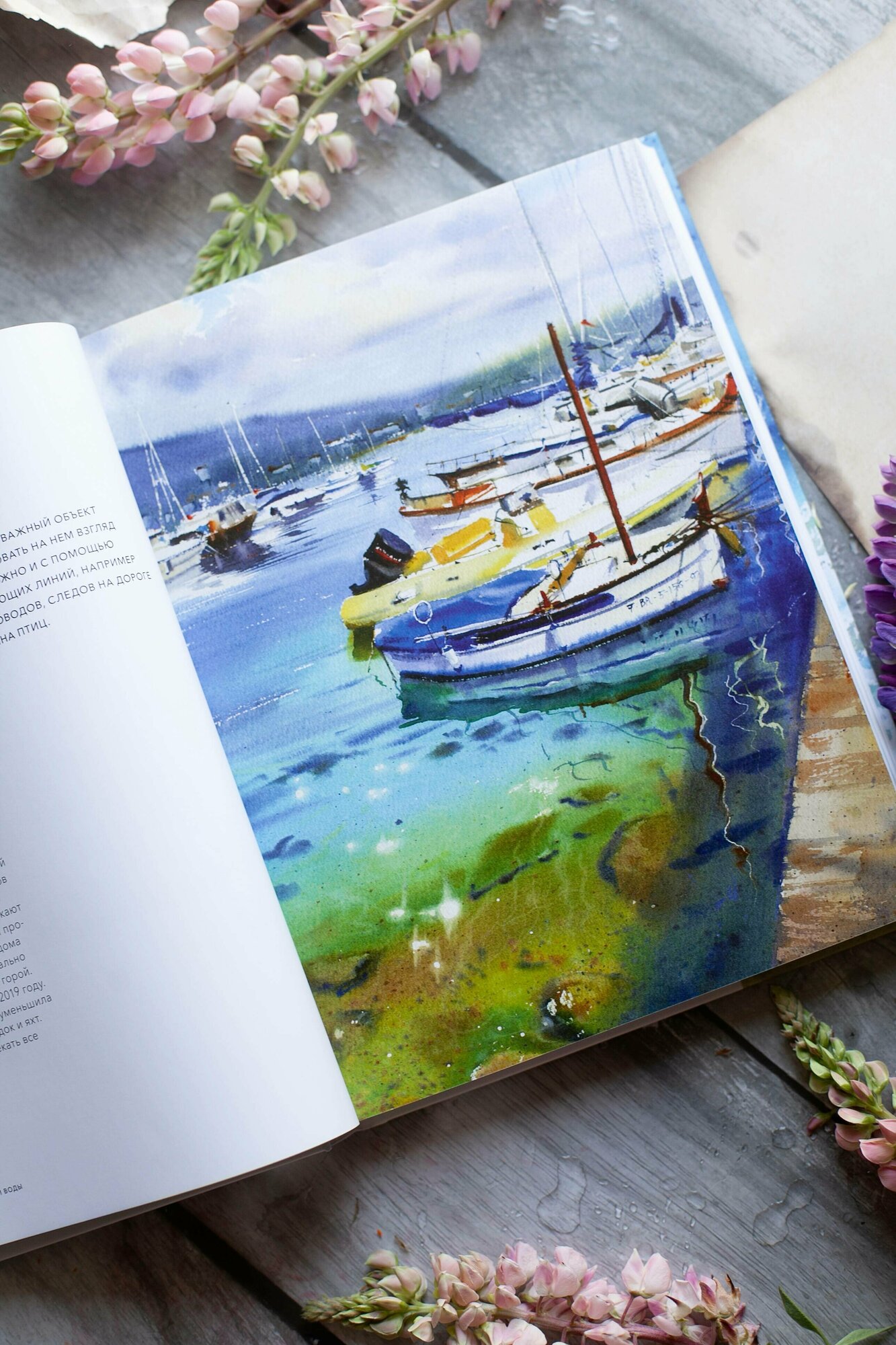 Люблю и покупаю книги от Миф по рисунку. Эта книжка прекрасный образец доступного гайда как для новичков, так и для продвинутых акварелистов. Здесь очень хорошая теоретическая часть, есть самые азы акварели для новичков. Есть сводка о материалах, и как их с умом использовать для получения желаемого результата (краски, бумага, кисти, вспомогательные средства). Основная часть книги это 23 мини-урока по рисованию самых разных сюжетов, связанных с водной стихией. Евгения Горбачёва простым языком объясняет сложные приёмы и вместе с читателем рисует то волны, то парусник, то тропических рыбок под водой. Уроки прописаны очень подробно. Каждый занимает не пару страниц, а с десяток. Рисовать легко и приятно, когда знаешь нужные лайфхаки и приёмы, а автор щедро делится ими с читателем. Издание очень качественное и увесистое, удачная верстка и мелованная бумага с яркими иллюстрациями.