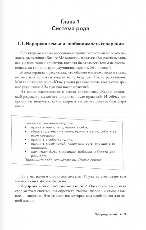 На эти и другие вопросы вы найдёте ответы в книге "Про родителей". Ее автор Юлия Хадарцева - лидер в системе метода расстановок в России, мировой рекордсмен по расстановкам, кандидат психологических наук, эксперт федеральных каналов, а также автор тренингов и марафонов, которые прошли более 35 000 человек.