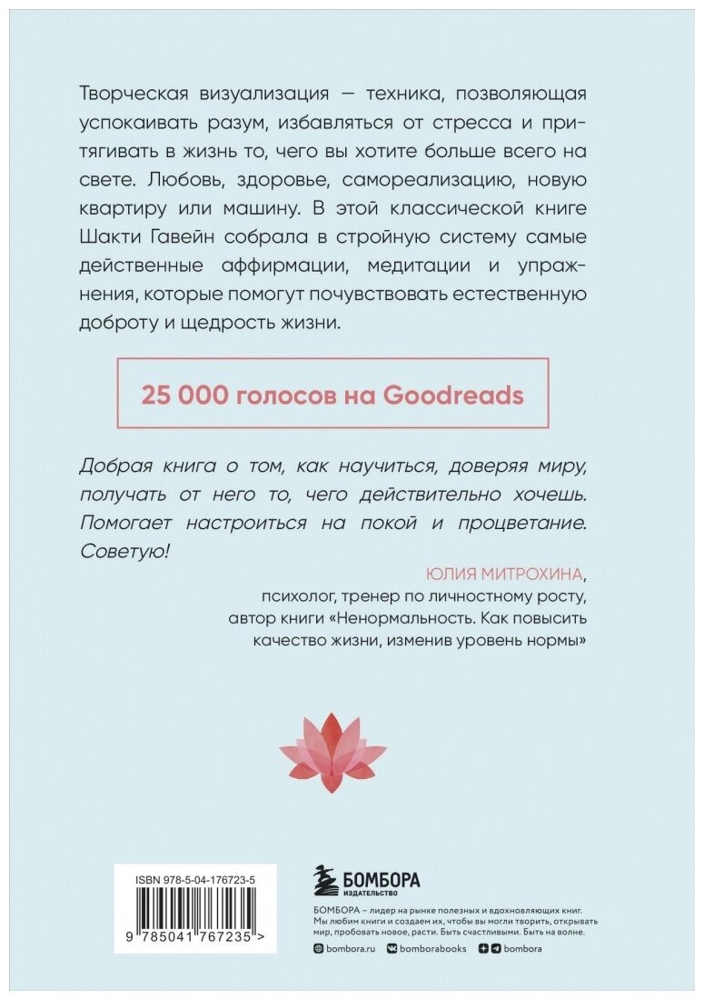 В книге раскрываются многие секреты и техники визуализации, аффирмаций, подробно описаны медитации. Последнее это особенный плюс, редко, где встретишь подробное описание медитации для различных целей. Красивая позитивная обложка, белая плотная бумага, приятное цветовое решение. Много практических решений и новых техник. Всё просто и понятно. Рекомендую. Полезная книга!