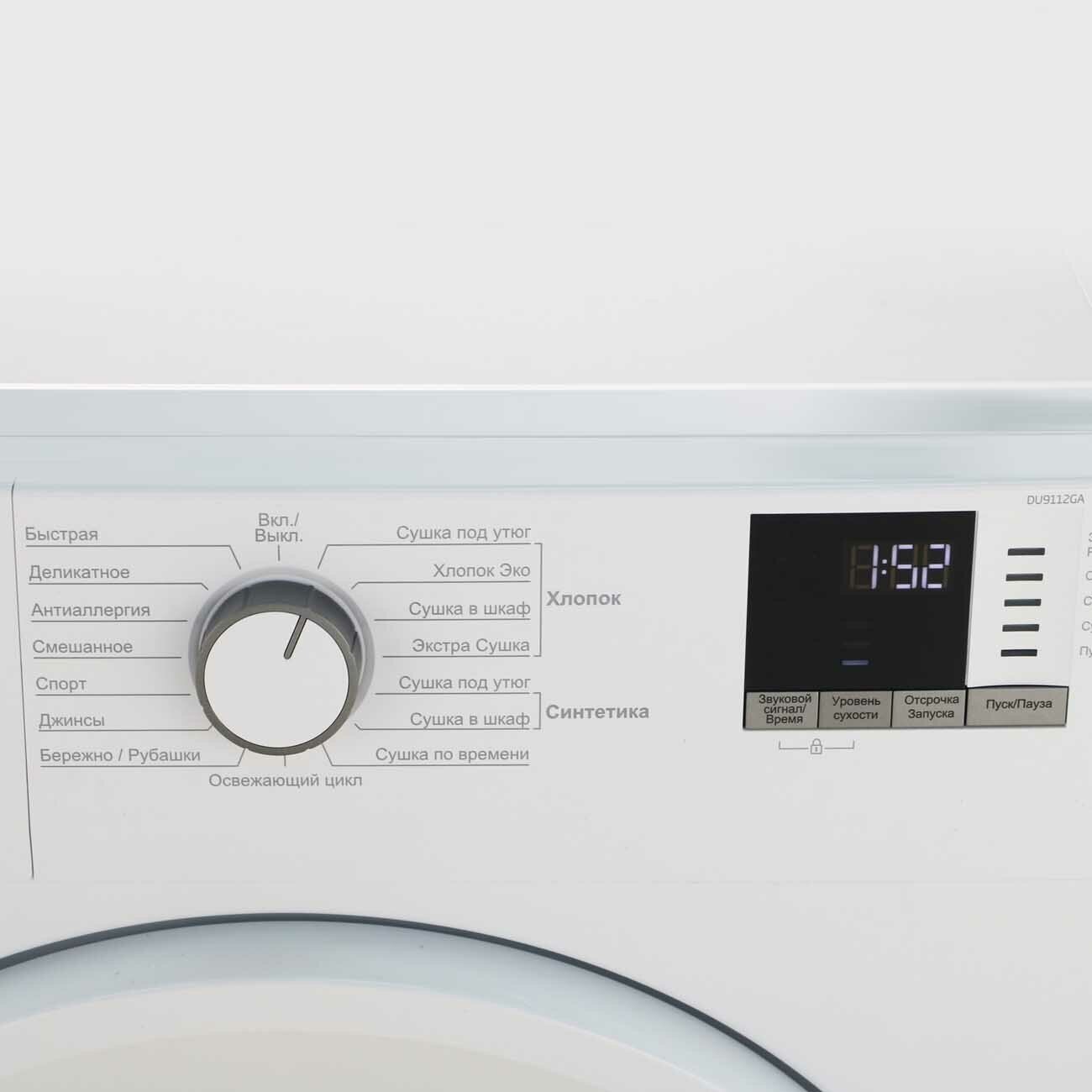 | Программы (режимы) сушки | Верхняя одежда, Гигиеническая сушка, Деликатная, Джинсы, Микс, Синтетика Глажка, Синтетика Сушка в шкаф, Хлопок "под утюг", Хлопок Сушка в шкаф, Хлопок Эко |