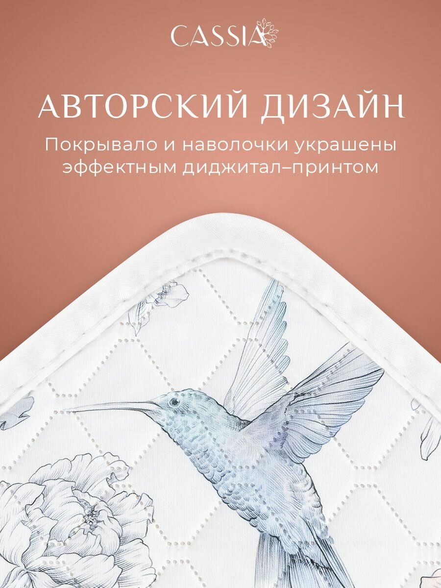 Комплект «Колибри»: покрывало (230*250 см) и 2 декоративные наволочки (50*70 см). Ткань лицевая: 100% микрофибра 75 г/м2, диджитал-принт. Наполнитель: полиэфирное волокно 15 г/м2, ткань оборотная — 100% микрофибра однотонная.