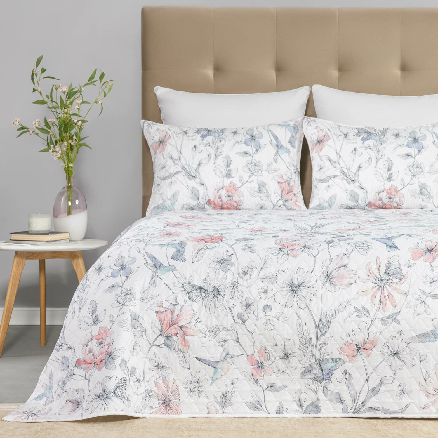 Это изысканное покрывало и наволочки украшены эффектным флоральным принтом. Красивые цветы и колибри красиво выделяются на фоне светлой ткани. Выразительный рисунок подчеркивает мягкость 100% микрофибры. Покрывало легко расстилается, не тускнеет и сохраняет первоначальный вид даже после многократной чистки.