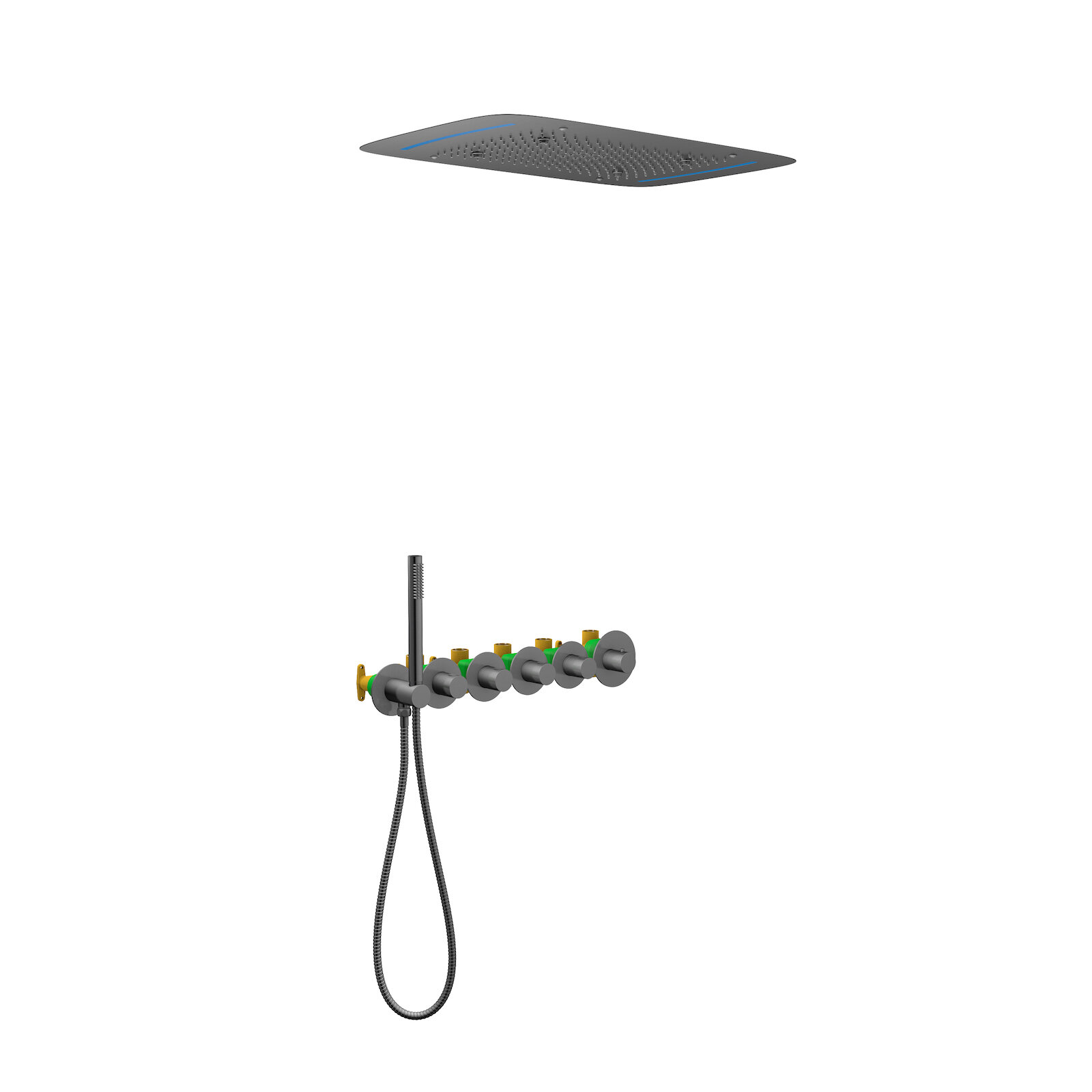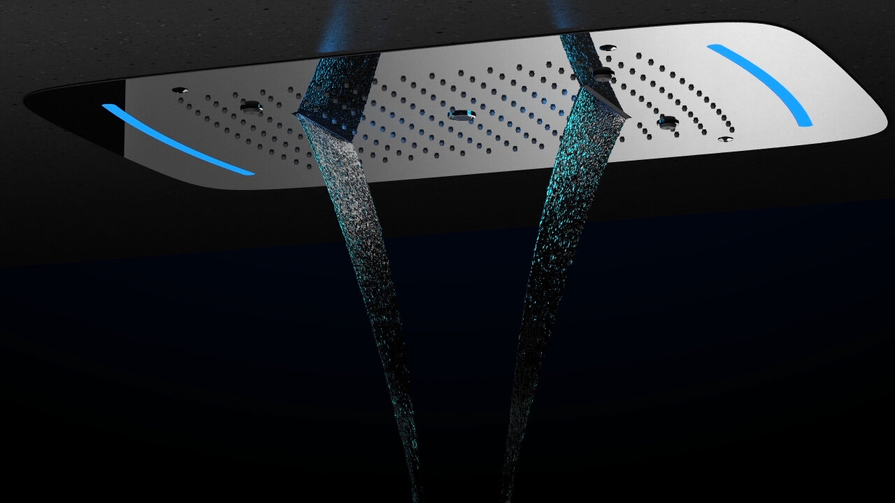 Встраиваемый блок управления душевой системой (латунный) - 1 шт. Корпус потолочного душа (латунный) - 1 шт. Душевая панель (латунная) 680*430 мм - 1 шт. Винты с гайками для крепления подвесных кронштейнов (комплект) - 4 шт. Держатель ручной лейки с подключением душа (латунный) - 1 шт. Подвесные кронштейны - 2 шт. Подводка к тропическому душу - 3 шт. Ручка дивертора - 4 шт. Ручка управления термостатом - 1 шт. Декоративные накладки с гильзами (комплект) - 6 шт. Ручная лейка (латунная) - 1 шт. Соединительная трубка для подключения ручного душа - 1 шт. Шланг душа 1,5 м - 1 шт. Блок управления подсветкой - 1 шт. Инвертор (преобразователь тока) - 1 шт. Т-образный соединитель проводов - 1 шт. Скрытый провод - 1 шт. Провод блока управления подсветкой - 1 шт. Инструкция - 1 шт.