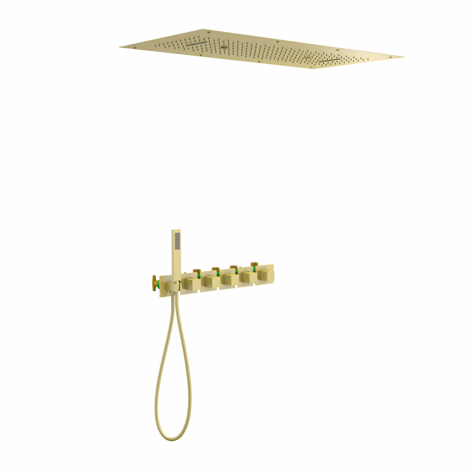 Встраиваемый блок управления душевой системой - 1 шт. Декоративные гильзы - 5 шт. Декоративные накладки - 6 шт. Ручка управления термостатом - 1 шт. Ручки управления режимами подачи воды - 4 шт. Соединительная трубка - 1 шт. Держатель ручной с подключением шланга для душа (латунный) - 1 шт. Ручная лейка (латунная) - 1 шт. Шланг душа 1,5 м - 1 шт. Корпус потолочного душа - 1 шт. Декоративная душевая панель 1000*500 мм (латунная) - 1 шт. Крепежные винты с гайками (комплект) - 6 шт. Крепежные винты душевой панели (комплект) - 8 шт. Подвесные кронштейны (комплект) - 3 шт. Подводка - 1 шт. Инструкция - 1 шт.