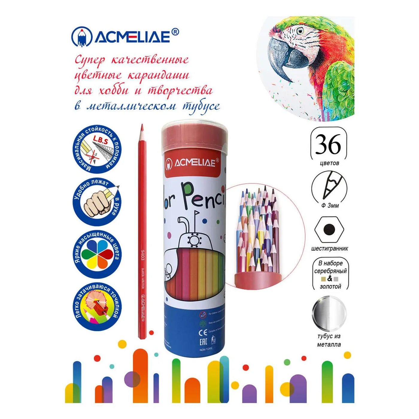 Длина карандаша 175 мм. Диаметр грифеля 3 мм. Идеальны для малышей от 3-х лет, школьников и всех любителей рисования. Металлический тубус позволяет брать карандаши с собой на отдых, на пленэр, в поездки. Качество соответствует европейским стандартам EN71 (требования к игрушкам) и REACH (без вредных веществ). Многослойное лаковое покрытие . Экологичны: используется древесина сертифицированных и специально подготовленных лесов.