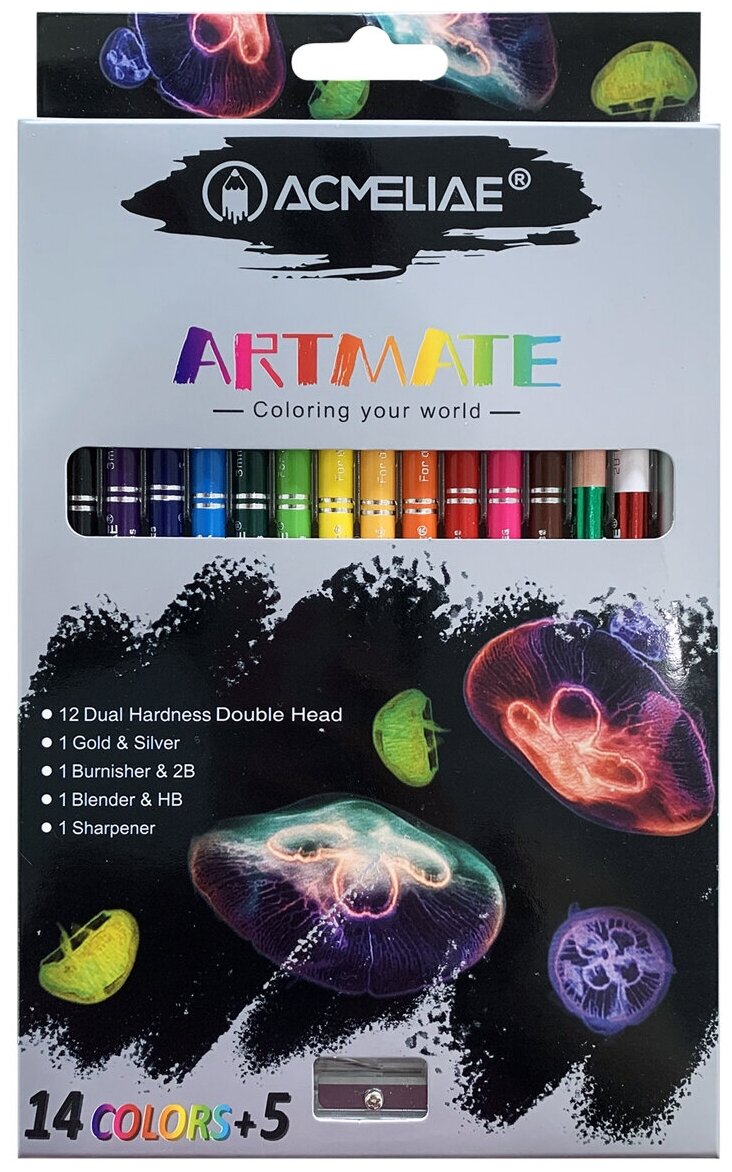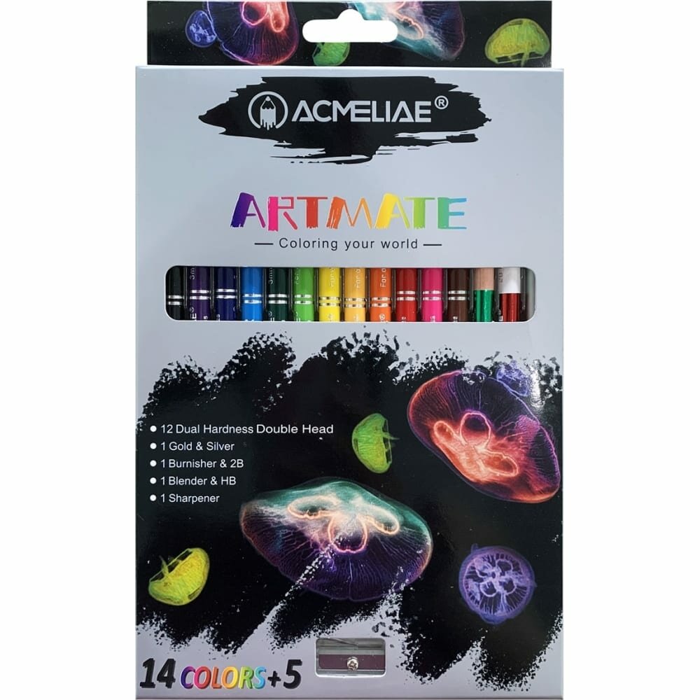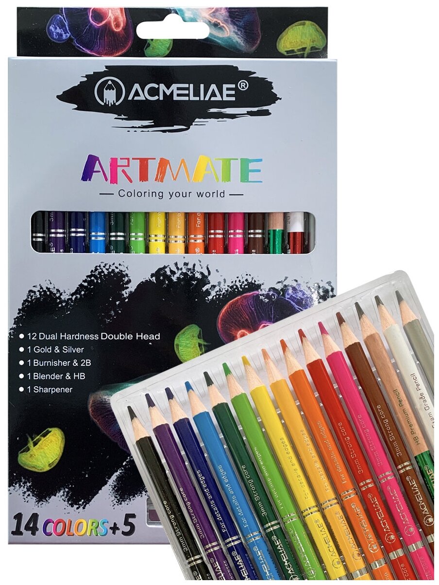 Набор карандашей цветных двусторонних ACMELIAE 15 шт + точилка в картонном футляре (43978)