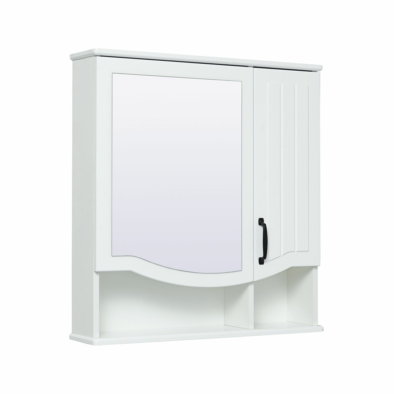 | Шкафчик в ванную имеет две распашные дверцы | слева с зеркальным фасадом, справа - с цветным, внизу - открытая полка. |