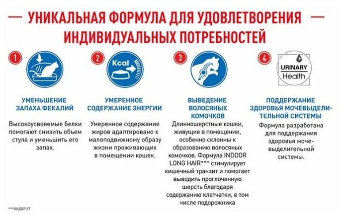 1) Снижение запаха фекалий: Малоподвижный образ жизни может привести к замедлению кишечного транзита и усилению запаха фекалий. Indoor 27® содержит белки с высокой усвояемостью (L.I.P.), оптимальный процент клетчатки и специальный комплекс нутриентов, стимулирующие пищеварение и способствующие снижению объема и запаха фекалий.