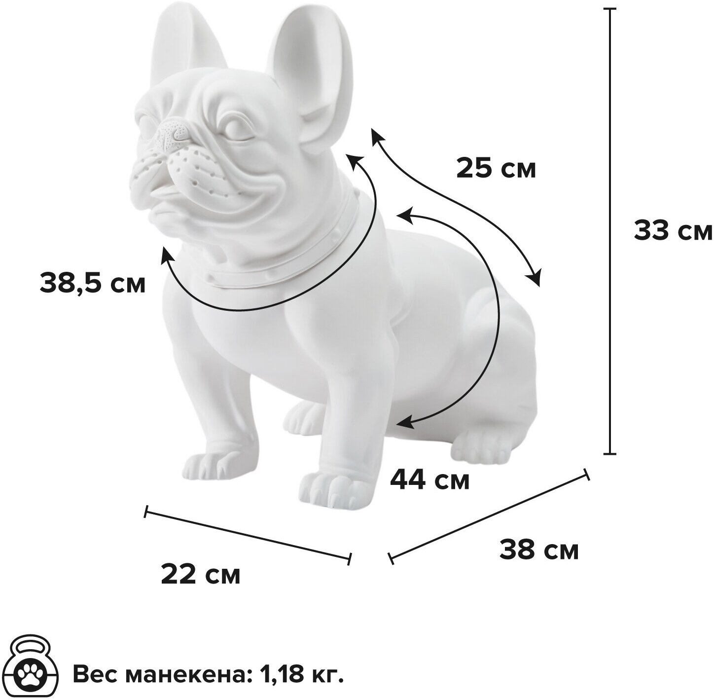 Манекен бульдожки сделан из упругого, но достаточно жесткого ПВХ, который гарантирует долговечность и устойчивость к трению, ударам и механическим повреждениям. Материал прекрасно противостоит воздействию солнечных лучей, жары и холода, а также, его можно помыть с помощью обычных бытовых моющих средств. Эта фигура выглядит элегантно, как настоящая статуэтка, и найдет свое место как в квартире, как украшение, так и в офисе, кафе или салоне, как элемент дизайна. Благодаря исключительному качеству изготовления собачий манекен не только эффектно выглядит, но и привносит в окружающее пространство ощущение роскоши.