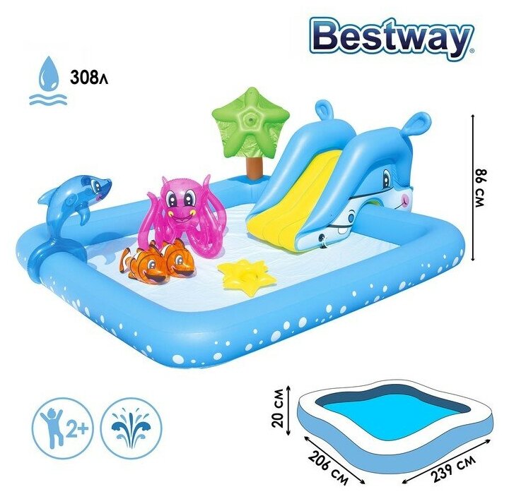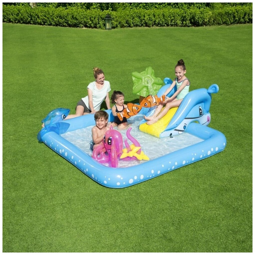 Игровой бассейн напоминает просторный прямоугольный аквариум с красочными рыбками-клоунами, дельфином и осьминогом. Для веселого спуска в воду предусмотрена горка, которую нужно установить на борт, а еще детки могу остудиться дождиком из разбрызгивателя.Особенности:Надувной бассейн имеет прямоугольную форму и привлекательный дизайн, исполненный в голубом цвете, благодаря чему в летний период станет украшением зеленой лужайки во дворе дома.Бассейн устанавливается на любой ровный участок, накачивается насосом (в комплект не входит) и наполняется водой.Борта изделия невысокие, мягкие, смягчающие падения во время водных игр. Предохранительные клапаны защитят от непредвиденного спускания изделия.Внутри бассейна просторно, потому резвиться в нем могут детки в компании своих друзей.В комплекте находится съемная горка, которую можно установить на борт и закрепить шнуром через люверсы. С горки дети буду спускаться прямо в бассейн наполненный водой.На борту установлен разбрызгиватель в виде звездочки, к которому необходимо подсоединить садовый шланг.А красочные надувные игрушки: дельфин, 2 рыбы-клоуна и осьминог-кольцеброс с 2 надувными кольцами разнообразят купание веселыми играми.Купание способствует закаливанию организма, развитию физической выносливости, укрепляет разные группы мышц, даря заряд бодрости и позитивного настроения.Слив воды из бассейна осуществляется с помощью специального, простого в использовании сливного клапана, к которому можно подключить садовый шланг для полива.В сдутом виде бассейн можно легко сложить в компактную для хранения и транспортировки форму.