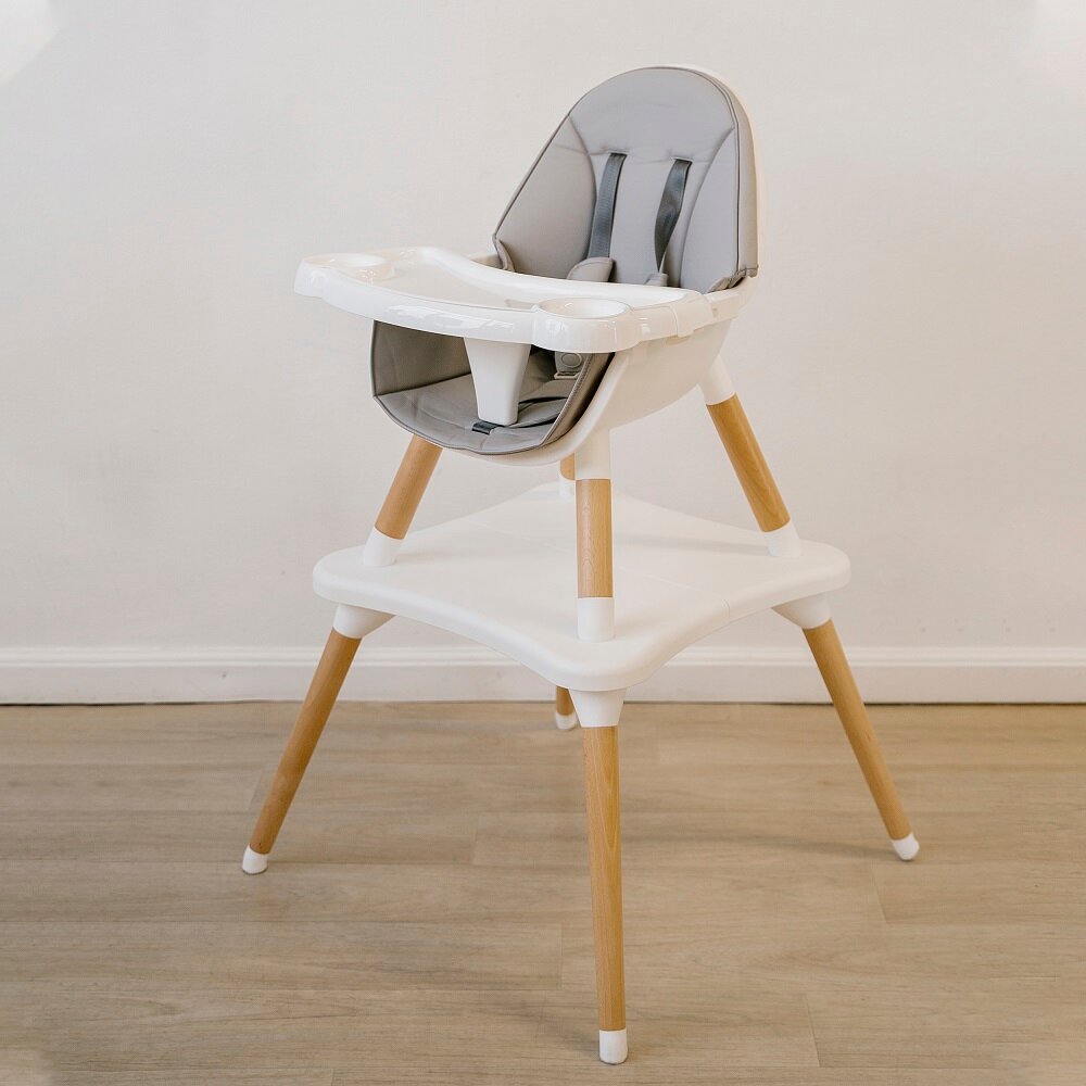 Модель имеет высоту 98 см, как раз ребенок сидит на уровне стола со взрослыми. Выполнен стул из качественного безопасного пластика и дерева, имеет съемный чехол из эко-кожи серого цвета, трехточечные ремни безопасности, регулирующиеся под рост ребенка.