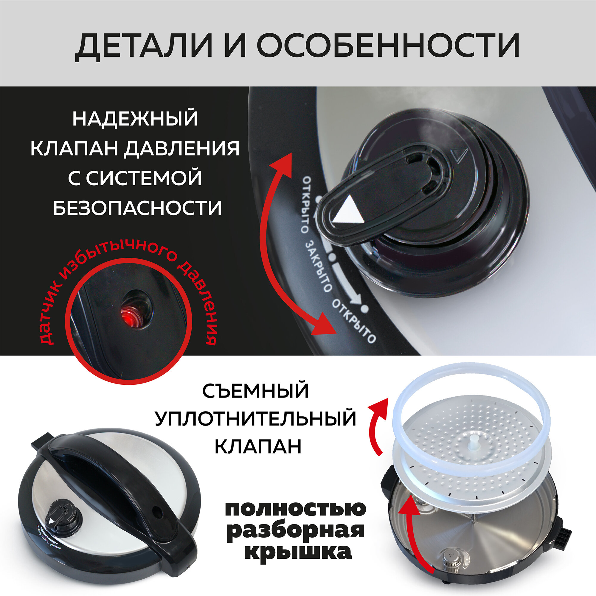 Многоуровневая система защиты контролирует повышение давления в заблокированном приборе и в экстренном случае нормализует их, не прерывая процесса приготовления. Скороварка мультиварка под давлением сократит Ваше время на приготовление различных видов мяса, наваристых супов, разнообразных гарниров, плова, напитков, многих видов десертов, выпечки и йогуртов. Мультиварка с чашей оснащена дополнительными функциями «Су-вид» и «Медленноварка», с помощью которых Вы легко приготовите блюда длительного томления, а также блюда долгого приготовления при низкой температуре для сохранения всех полезных свойств продуктов. А с помощью функции «Мультиповар» мультиварка электрическая приготовит для Вас блюдо по собственному рецепту с заданными Вами параметрами температуры, давления и времени. Мультиварка пароварка скороварка имеет удобные настройки в широких диапазонах: регулируйте температуру с точностью до 1℃ и время - с точностью до 1 минуты.