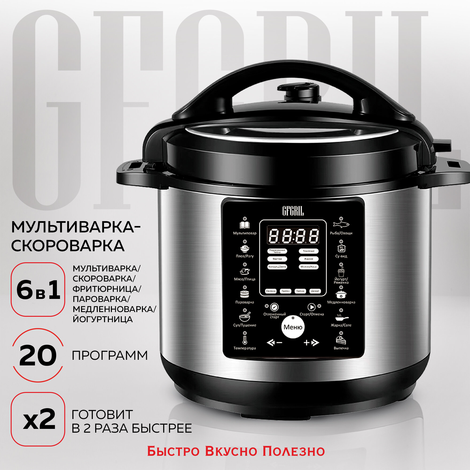 Скороварка мультиварка GFGRIL GFM-500 оснащена 20 автоматическими программами, часть из которых работает в режиме мультиварки при нормальном давлении, другая - при высоком давлении в режиме скороварки.