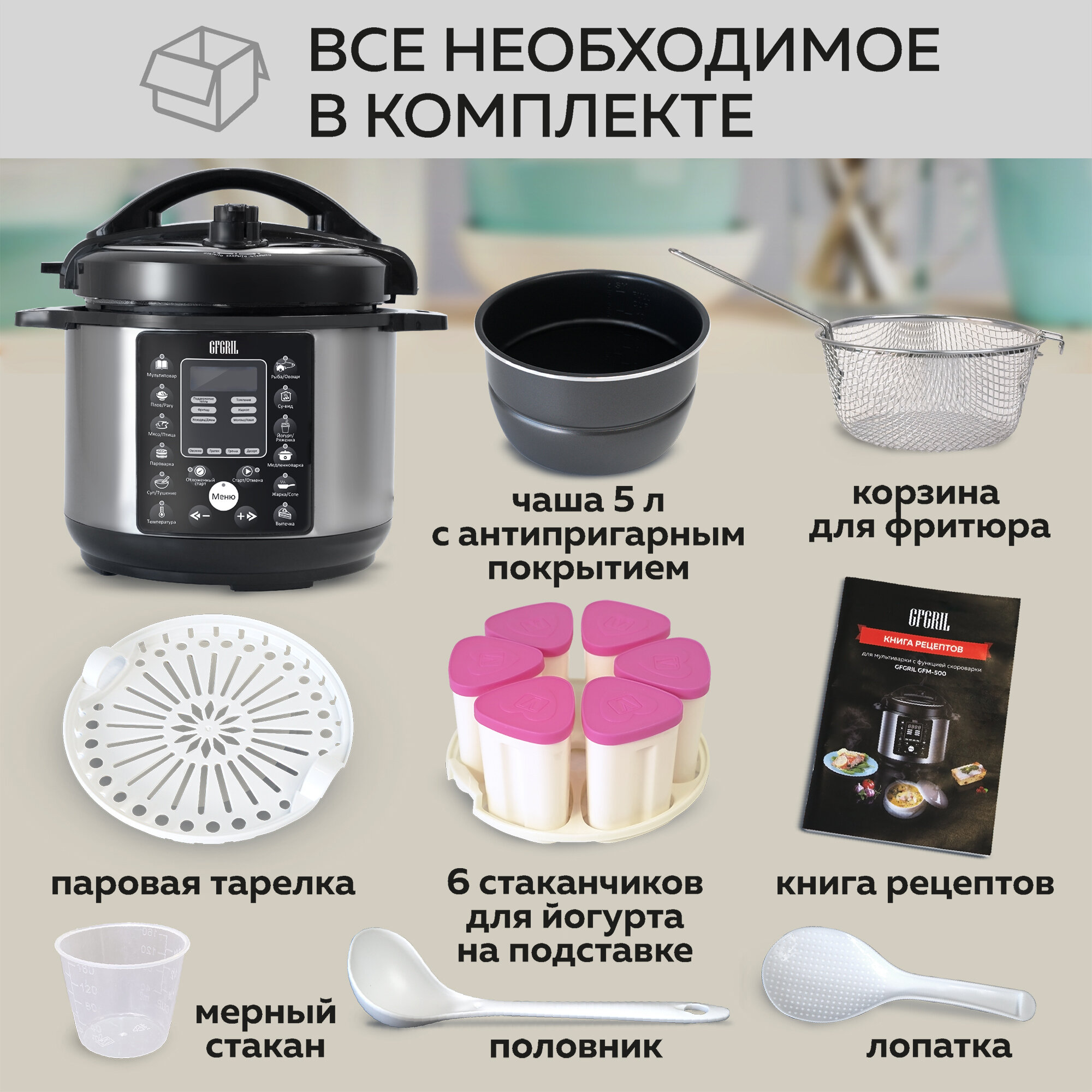 Мультиварка с функцией скороварки GFGRIL GFM-500— это мультиварка 5 литра с антипригарным покрытием из тефлона премиального качества, которое предотвратит пригорание готовых блюд. Благодаря высокой мощности 1000 Вт, иллюстрированной книге рецептов, входящей в комплект, Вы легко и быстро приготовите даже самые изысканные блюда. Мультиварка включает в комплект поставки контейнер для приготовления на пару, корзину для фритюра, а также 6 стаканчиков для приготовления йогурта с держателем.