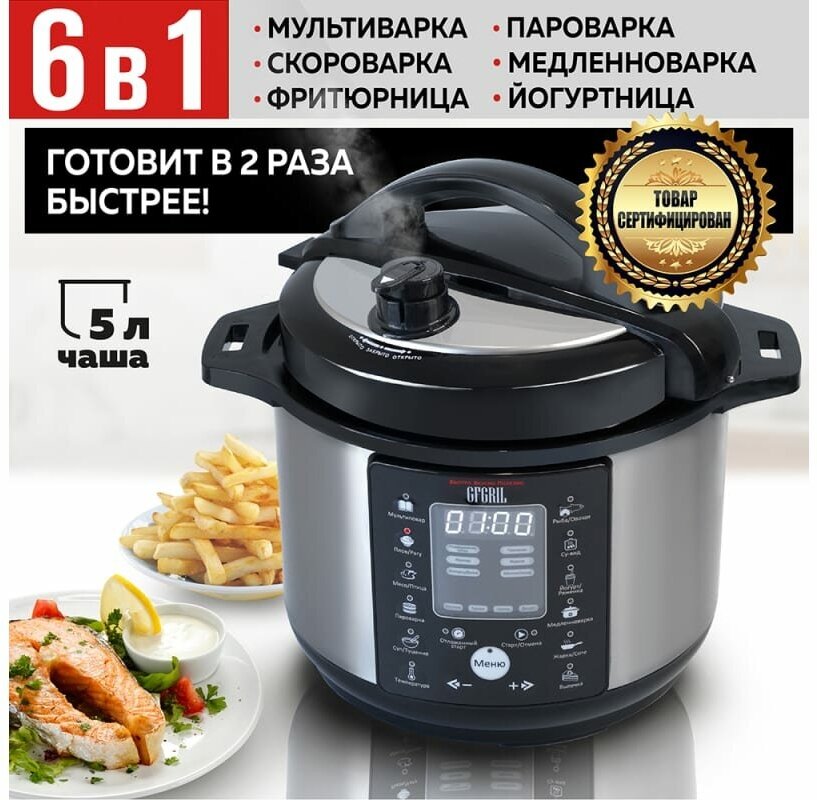 Мультиварка с функцией скороварки GFGRIL GFM-500 6 в 1 - это современная многофункциональная мультиварка с давлением, прибор нового поколения для приготовления пищи, который позволяет значительно сократить время приготовления Ваших любимых блюд, при этом сохраняя все полезные свойства продуктов. Мультиварка 5 литров совмещает в себе сразу несколько функций, благодаря которым заменит на Вашей кухне такие приборы как мультиварка пароварка скороварка, йогуртница, фритюрница, а также медленноварка.