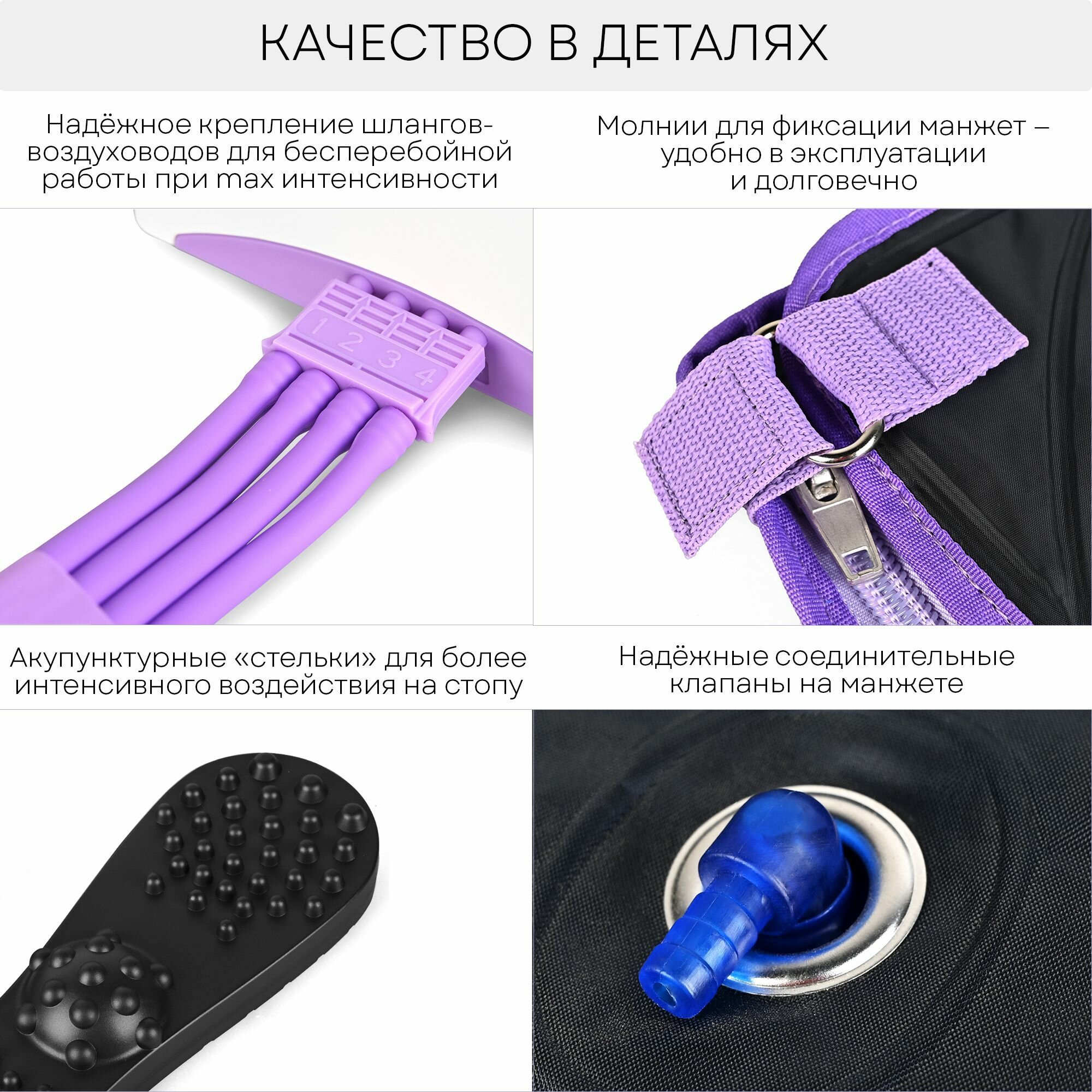 Манжеты увеличенного размера (XL-размер) с 4мя воздушными камерами в каждой обеспечивают устойчивый лимфодренажный эффект: для уменьшения отёчности в ногах, снятия усталости, улучшения кровообращения, а также борьбы с целлюлитом. Лимфодренаж является хорошей профилактикой возниконовения ранних «сосудистых звездочек» и «варикоза».