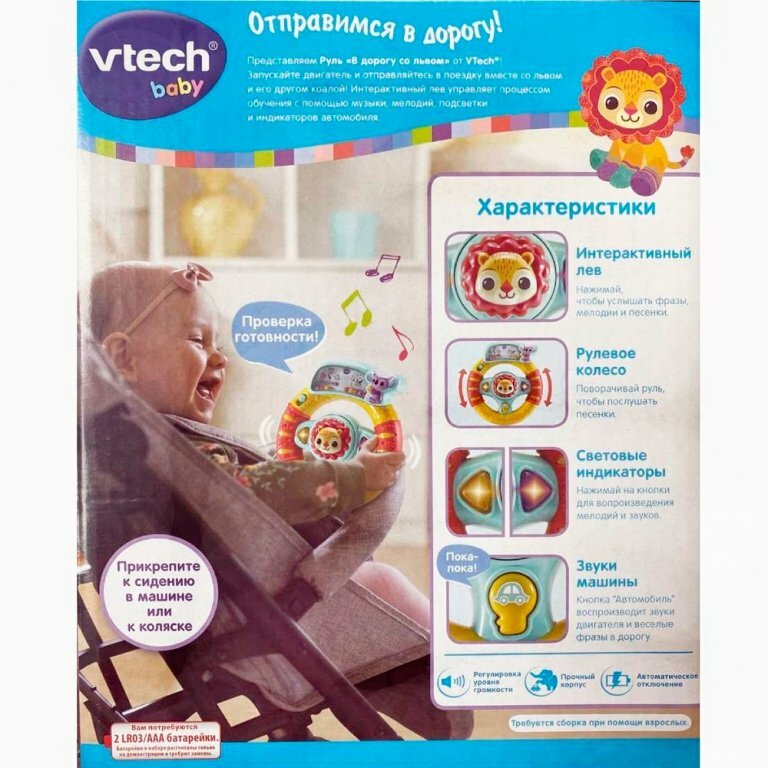 Запускайте двигатель и отправляйтесь в поездку вместе со львом и его другом коалой! Интерактивный лев управляет процессом обучения с помощью музыки, мелодий, подсветки и индикаторов автомобиля. Игрушечный руль развивает сенсорику и моторику, способствует изучению и открытиям нового.