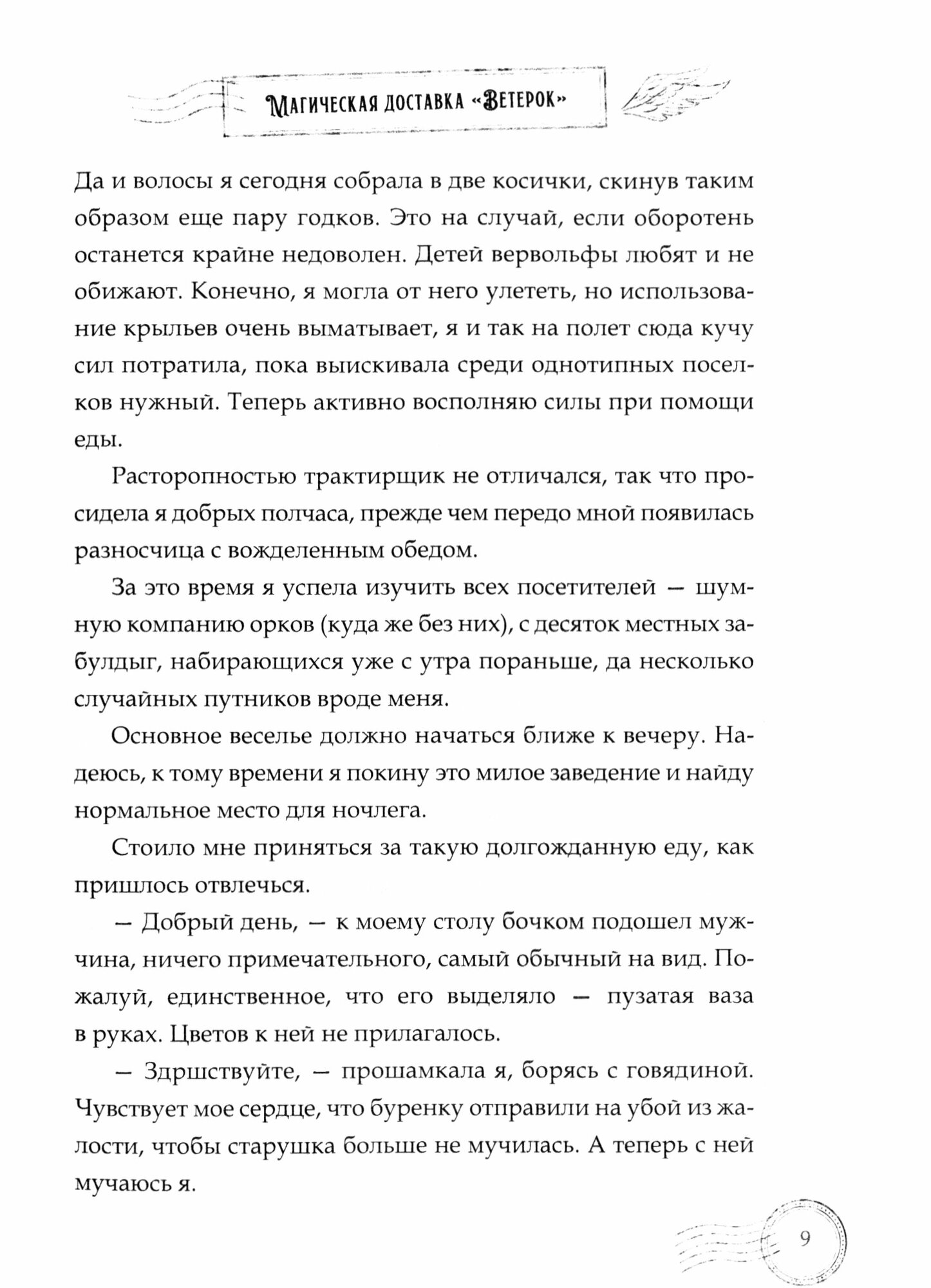 Замечательная история из цикла "Магия полёта" ("Магическая доставка «Ветерок»", "Курьер по особым поручениям", "Воздушный атташе"). "Будем рады новым заказам, обращайтесь в любое время, доставим в любое место!" - эту фразу каждый раз говорит ГГ-ня Лара (недоучившийся и весьма талантливый некромант) и ее коллеги получателям посылок. Другое дело, что не все адресаты - люди. Да и доставка уникальная, ведь почтальоны передвигаются от одного населенного пункта до другого на... крыльях, которые каждому курьеру подбирает артефакт. И хотя работа у сотрудников магической доставки не слишком простая и даже опасная, платят за нее неплохо. Хотя с начальством - обаятельным и строгим вампиром - не поспоришь. Но вот крылатые почтальоны начинают исчезать. И к Ларе шеф прикрепил то ли помощника, до ли стажера, то ли охранника Эдриана - очень таинственного человека. Героев ждут приключения, опасности, тайны и даже призрак, не желающий упокаиваться. Сюжет книги захватывающий, интрига закручена, флешбэки и сеттинг продуманы, персонажи такие разные и непростые. Язык и стиль автора - на высоте. Читается книга с огромным удовольствием.