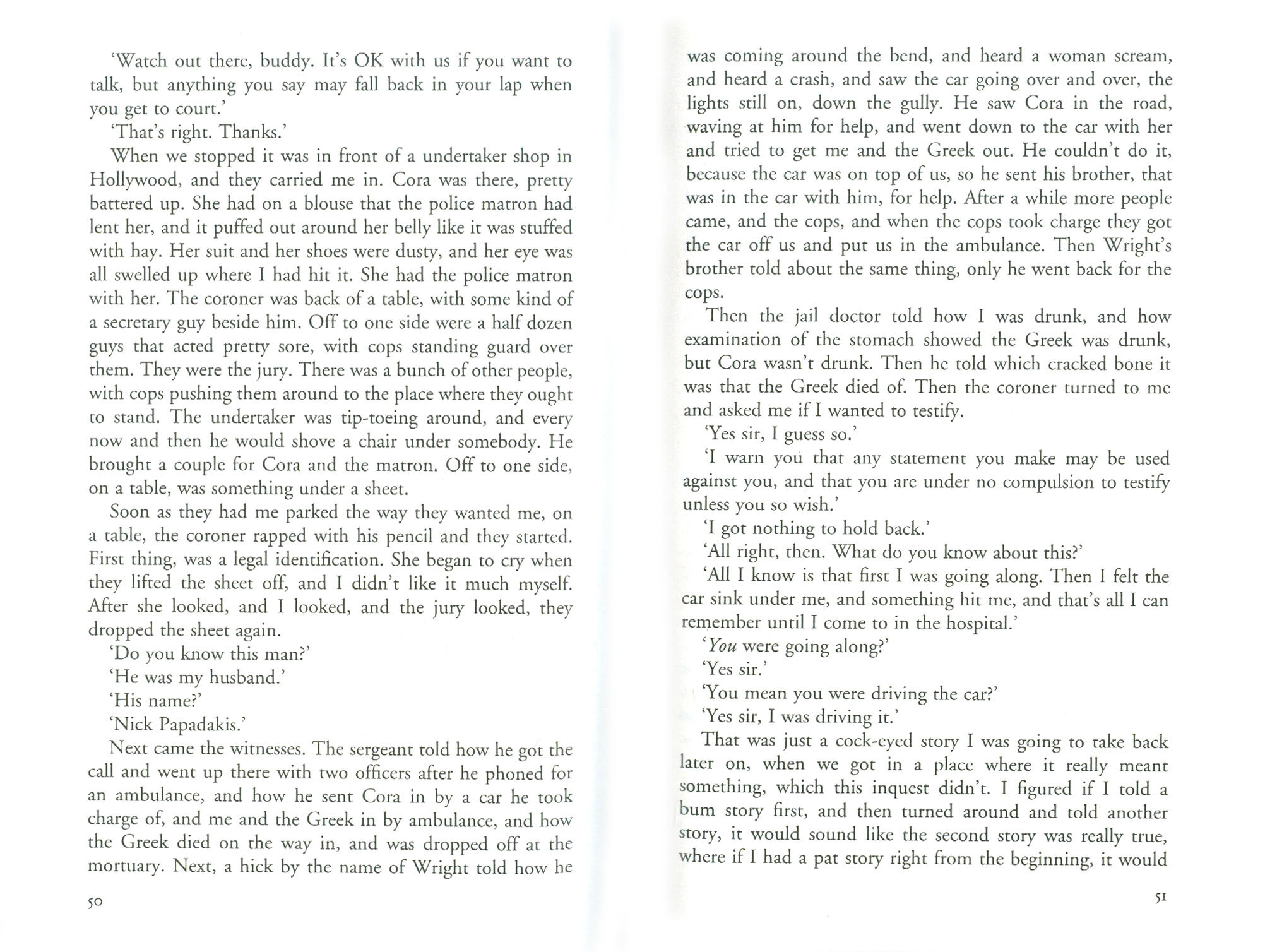 The torrid story of Frank Chambers, the amoral drifter, Cora, the sullen and brooding wife, and Nick Papadakis, the amiable but inconvenient husband, has become a classic of its kind, and established Cain as a major novelist with a spare and vital prose style and a bleak vision of America.