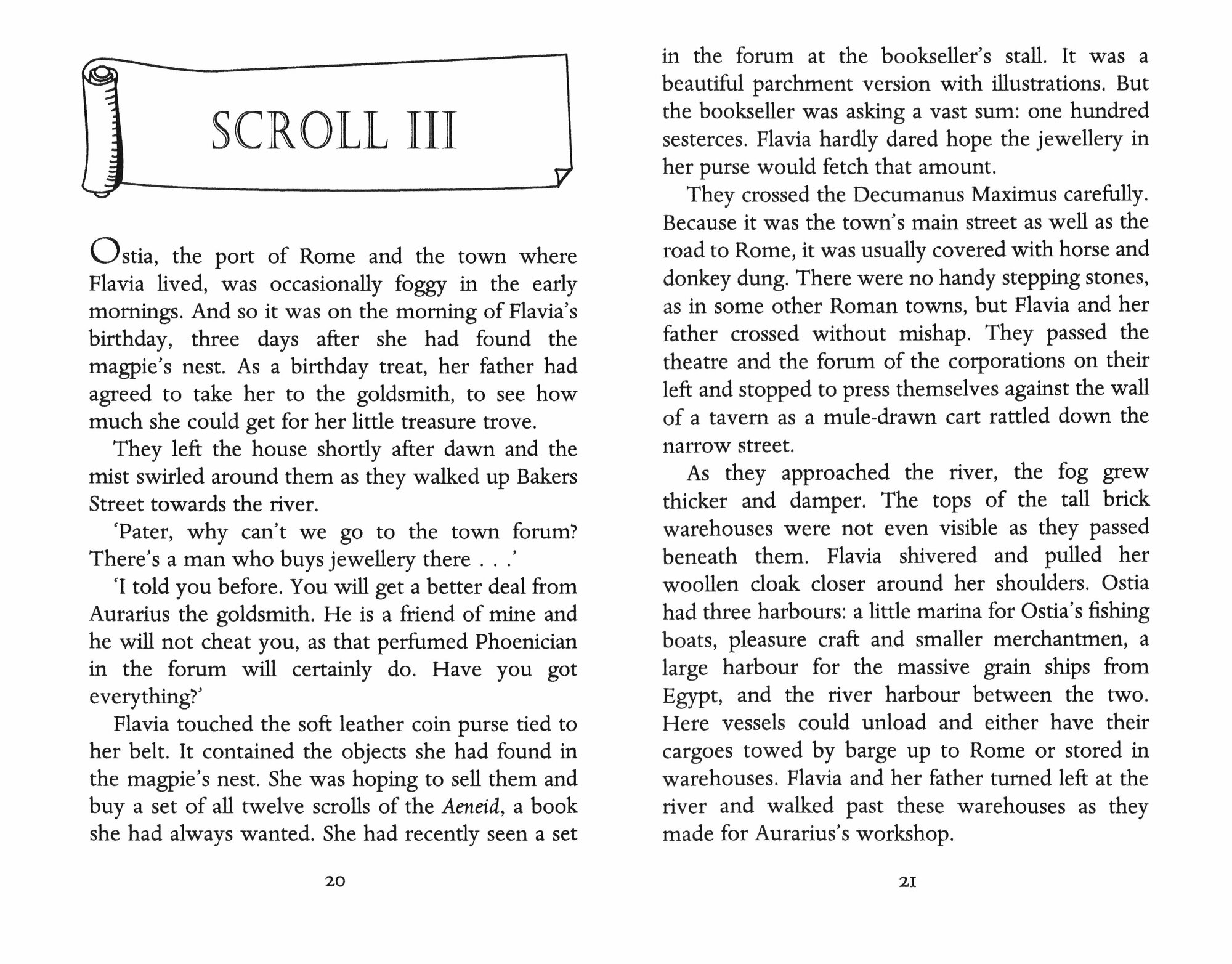 Flavia Gemina is a natural at solving mysteries. The daughter of a ship's captain living in Ostia, the port of Rome, in AD79, she and her three friends, Jonathan, a Jewish boy (and secretly a Christian); Nubia, an African slave girl; and Lupus, a mute beggar boy, must work together to discover who is beheading the watchdogs that guard people's homes, and why.