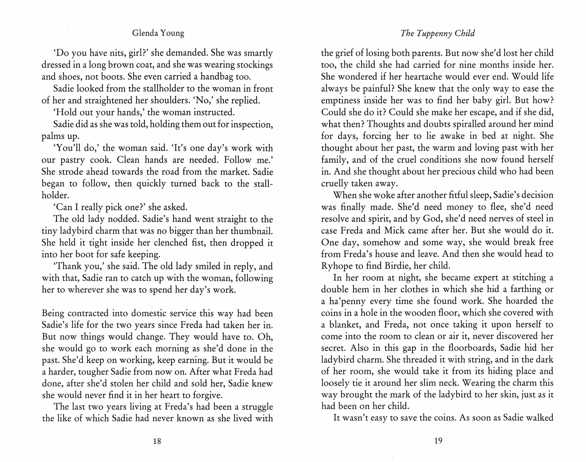 Those are the words that haunt Sadie Linthorpe. She is the talk of Ryhope when she arrives there, aged seventeen, alone, seeking work and a home in the pit village. But Sadie is keeping a secret - she is searching for her baby girl who was taken from her at birth a year ago and cruelly sold by the child's grandmother.