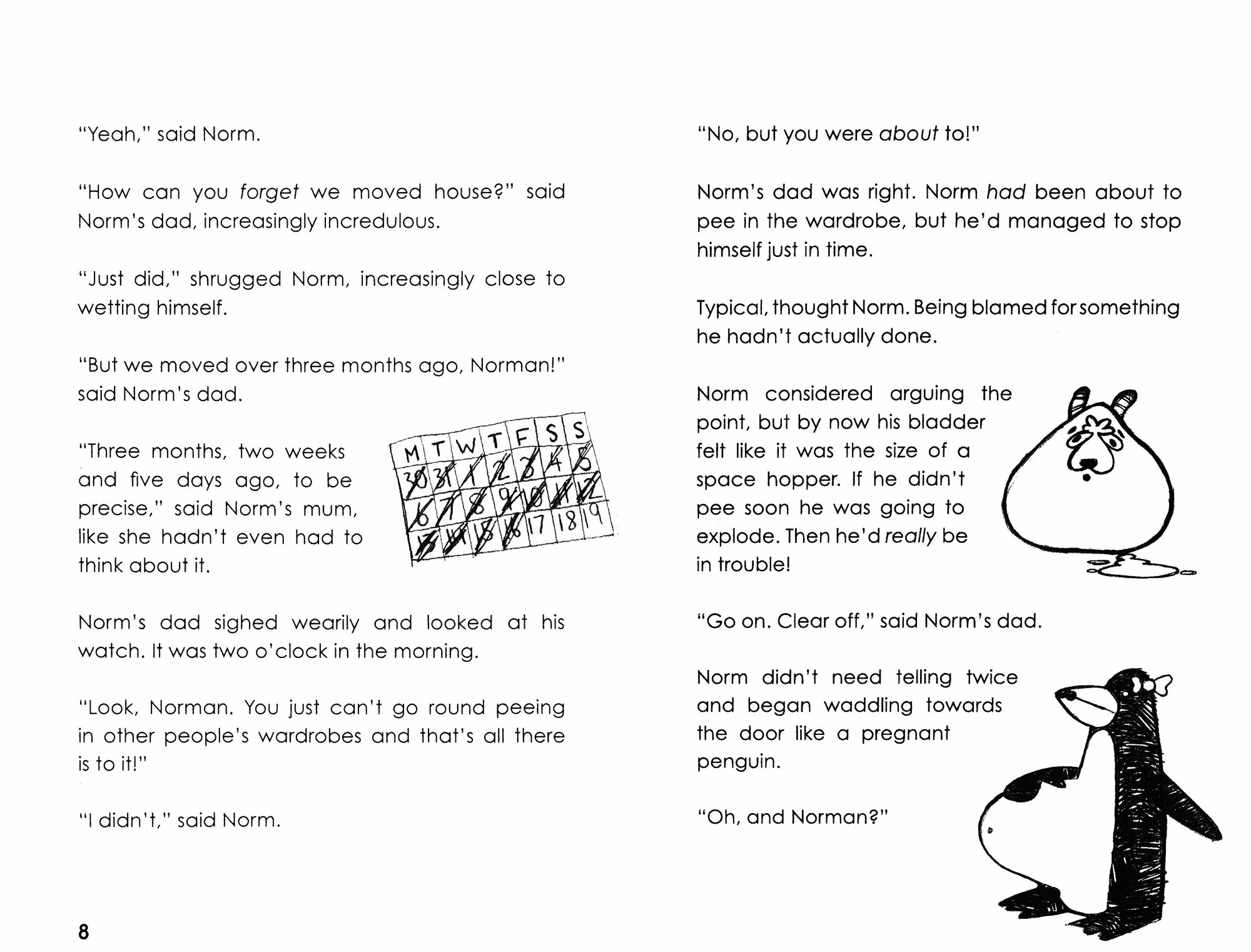 Why on earth did Norm's family have to move, anyway? In their old house he'd never tried to pee in anything other than a toilet. And when Norm is in bed, he's kept awake by his dad snoring like a constipated rhinoceros!