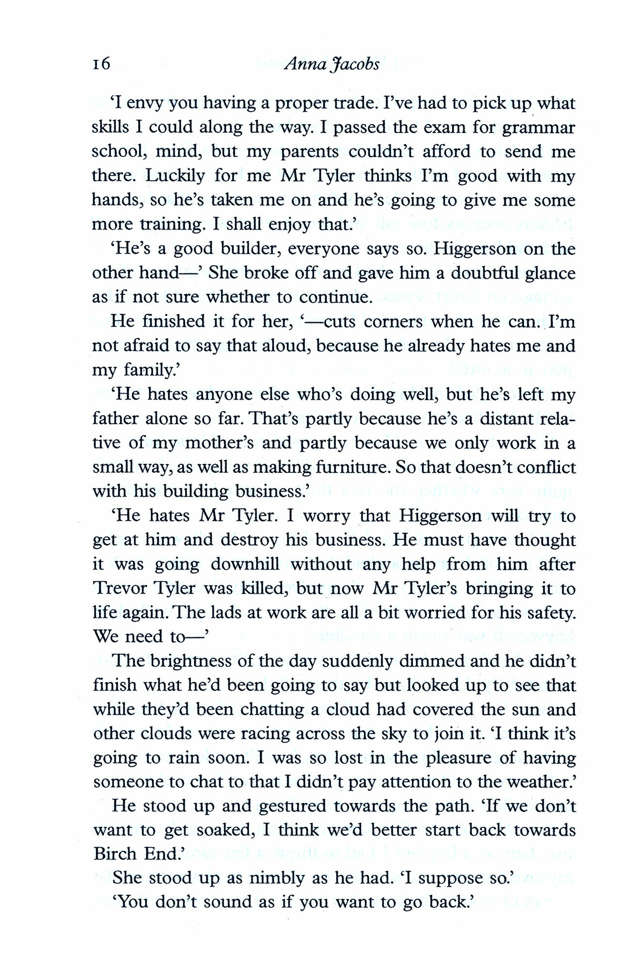 As the only female cabinet maker in the valley in 1935, Frankie Redfern is unusual. She faces prejudice even from her own mother. But she's content working for her father, and is unwilling to give up her independence or the work she loves for marriage.