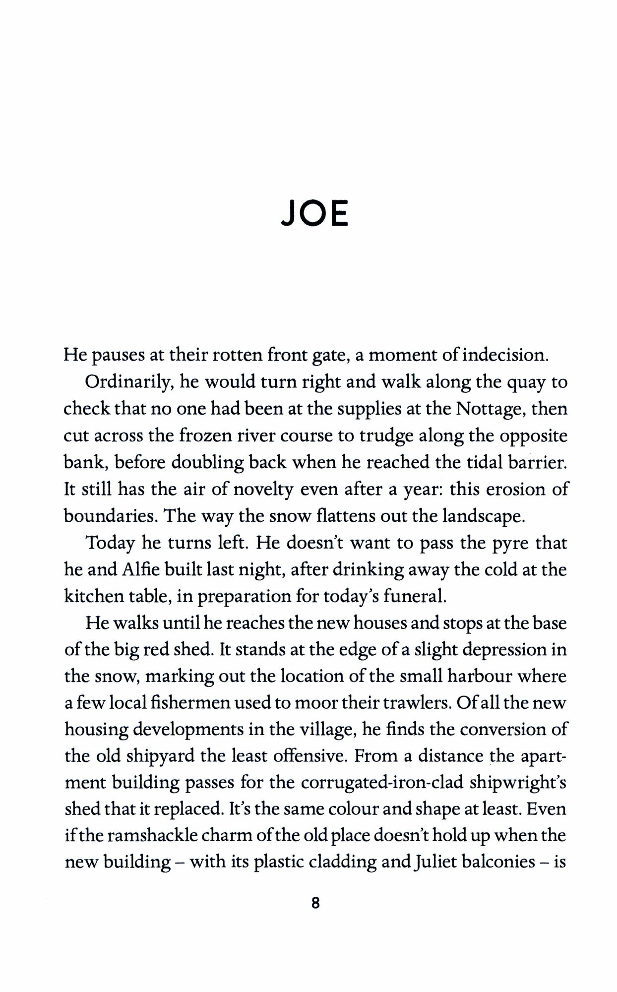 Never thought he would miss the mud: the gleaming, slickness of it. The slap and suck at the turning of the tide; its rich, bird-shit stink after a hot day and a couple of pints at the Rose. Or the green-blue-yellow hues that marked the changes in the light, as the days and seasons marched over the village and the river. And now, just snow. Endless snow.