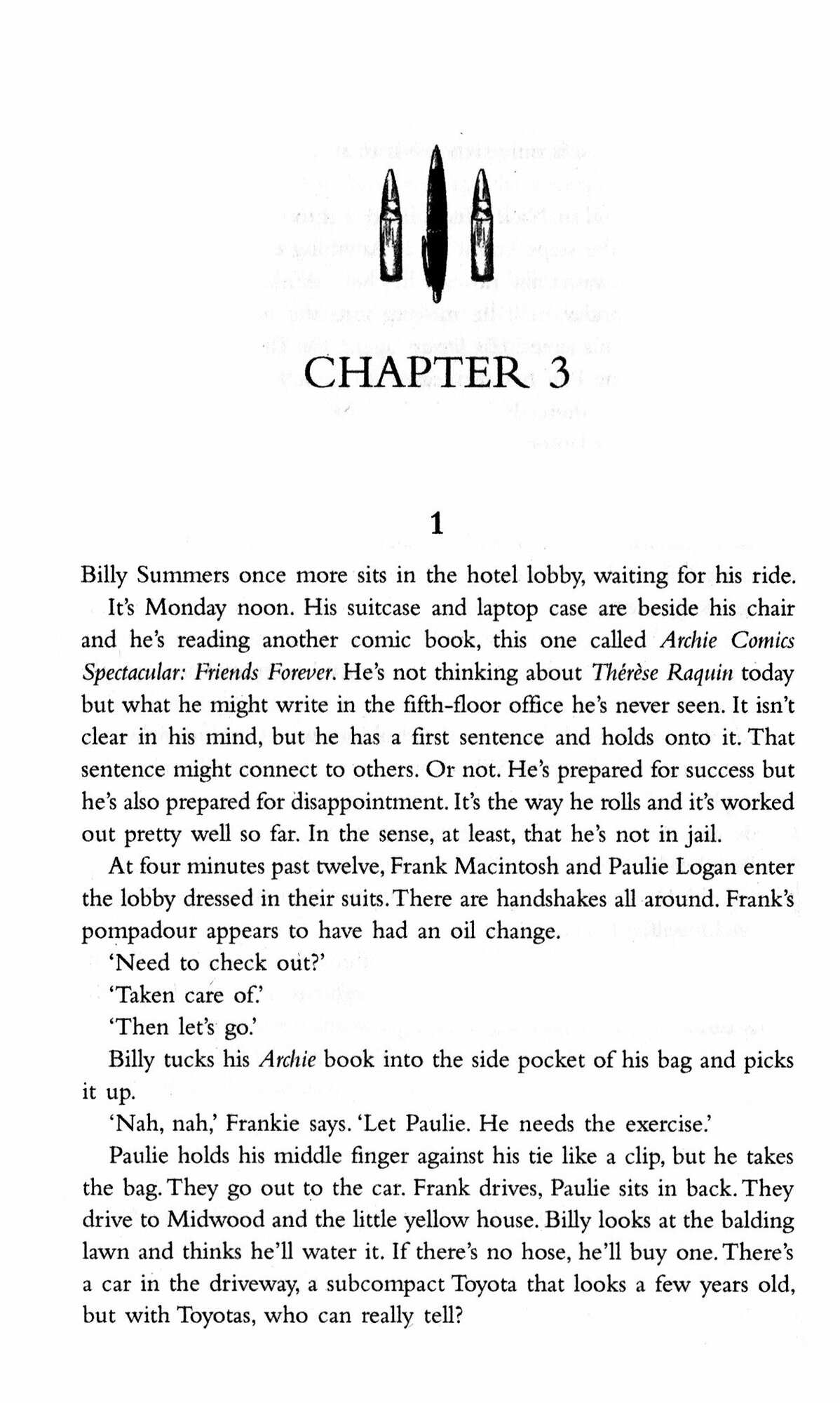 Billy Summers is a man in a room with a gun. He's a killer for hire and the best in the business. But he'll do the job only if the target is a truly bad guy. And now Billy wants out. But first there is one last hit. Billy is among the best snipers in the world, a decorated Iraq war vet, a Houdini when it comes to vanishing after the job is done. So what could possibly go wrong?