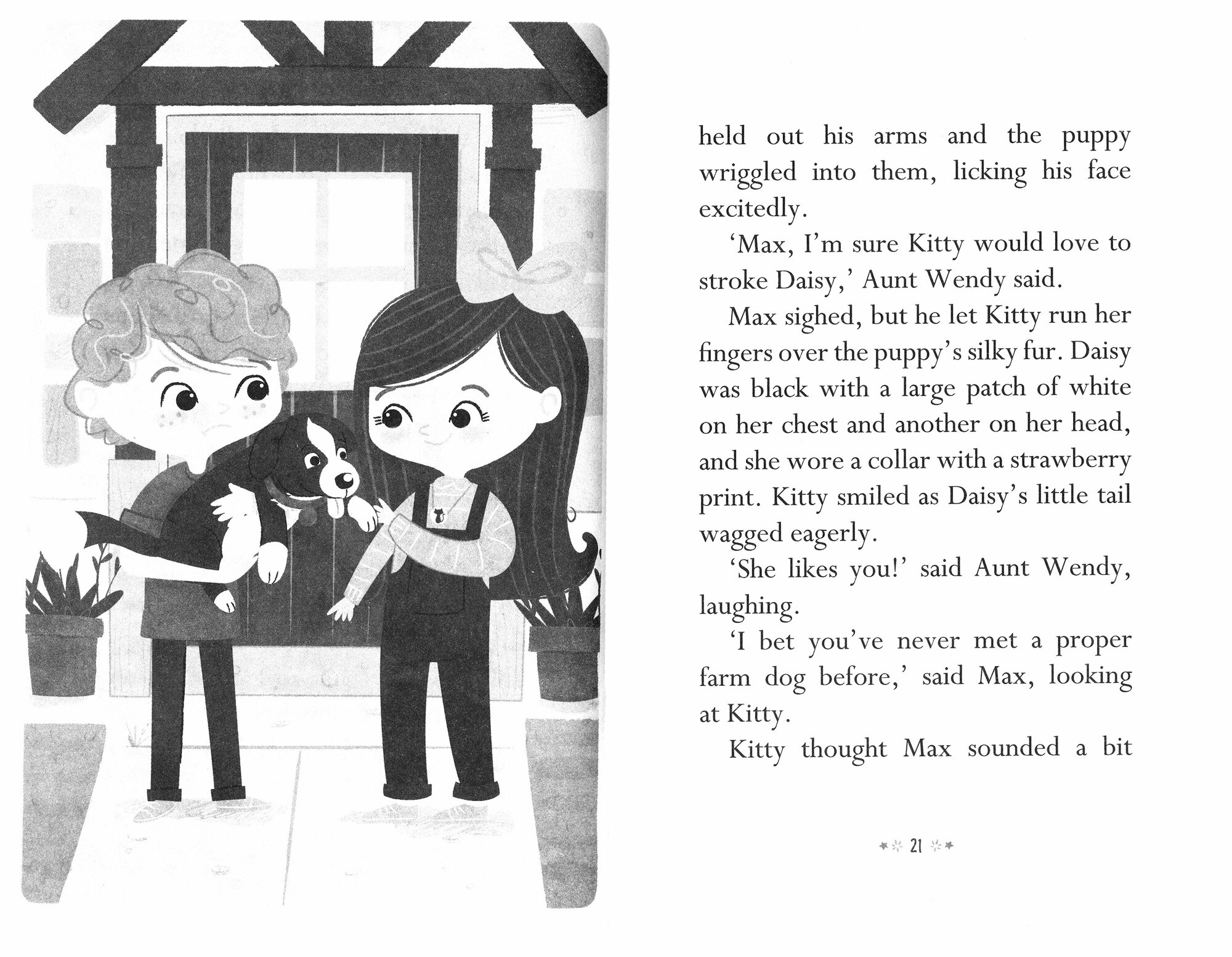 Kitty is going to her cousin's farm for the weekend! There are lots of animals to meet, including Star, the old farmhouse cat, and Daisy, an adorable black and white puppy with sad eyes.
