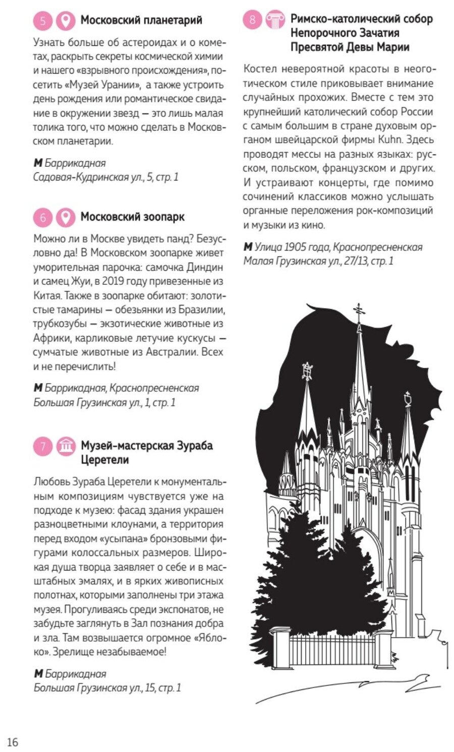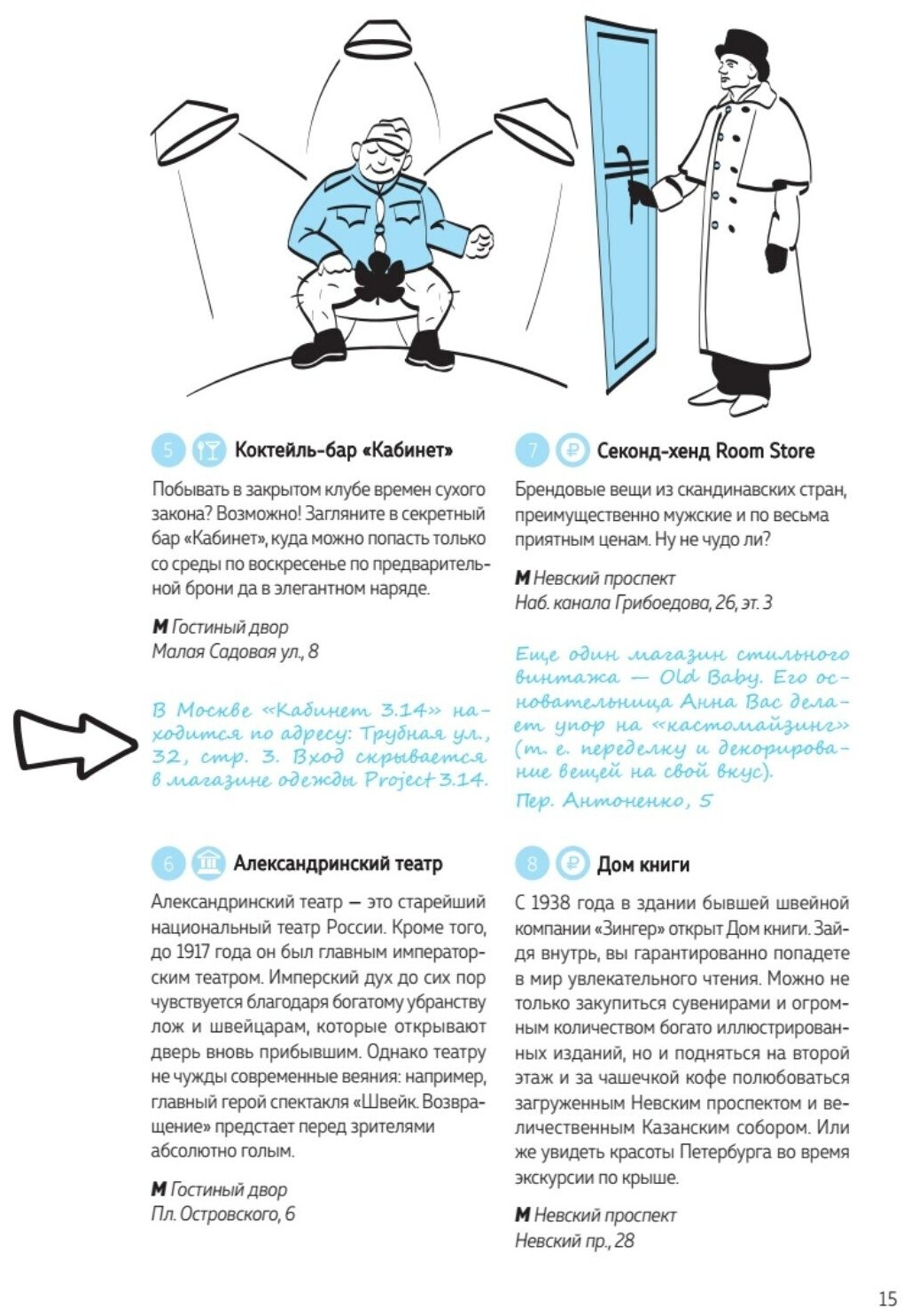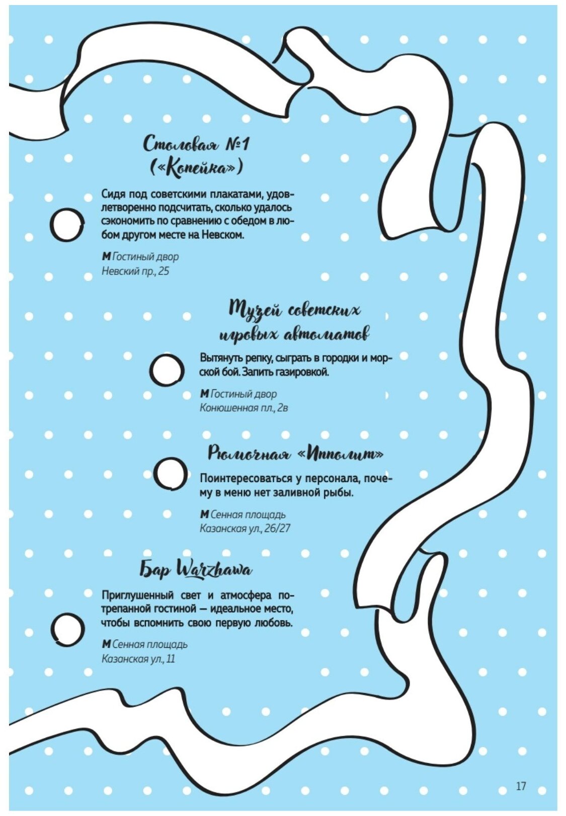 Такая книга - идеальный вариант для продуманного путешествия по Москве и Санкт-Петербургу. Лично я всегда очень тщательно готовлюсь к путешествиям, хочется посмотреть и успеть как можно больше, простроить логические маршруты, чтобы потратить как можно меньше времени на дорогу. Такие маленькие, но удаленькие путеводители - идеальные помощники. Сама я всю жизнь живу в Петербурге и поэтому сразу повернула книгу стороной с Москвой. Да, книга начинается с обеих сторон, но с одной стороны - Питер, а с другой - Москва. Книга разделена пополам и разграничена цветами: розовые странички у Москвы, а голубые - у Питера. Так вот, я начала читать сторону Москвы, потому что, стыдно признаться, совсем не знаю этот город, однако, неуклюже выронив книгу, она открылась на "Питерской стороне" и оказалось, что тут я тоже чего-то не знаю. Книгой можно пользоваться с учетом того, что вы ищите: музеи и театры, "спрятанные" диковинки, улочки, сады, на которые можно только случайно наткнуться в городе, магазины для шопинга, архитектурные постройки или рестораны, касаемо еды, здесь упомянуты даже не популярные, но стоящие места. А если вы устали от города, пригороды наших столиц так же особенны и интересны. Везде сразу помечены адреса, а где-то так же расположится история места или названия, тоже как процесс окультуривания. Единственный минус книги - это действительно сложно читабельный шрифт и изобилие ярких пятен. Лично я буду изучать эту книгу перед путешествием, намечая свой личный маршрут. Яркий дизайн страниц может отвлекать и путать вас во время путешествия, а хотелось бы, чтобы ваши глаза в этот момент внимали только красоты нового для вас города или города "по-новому".