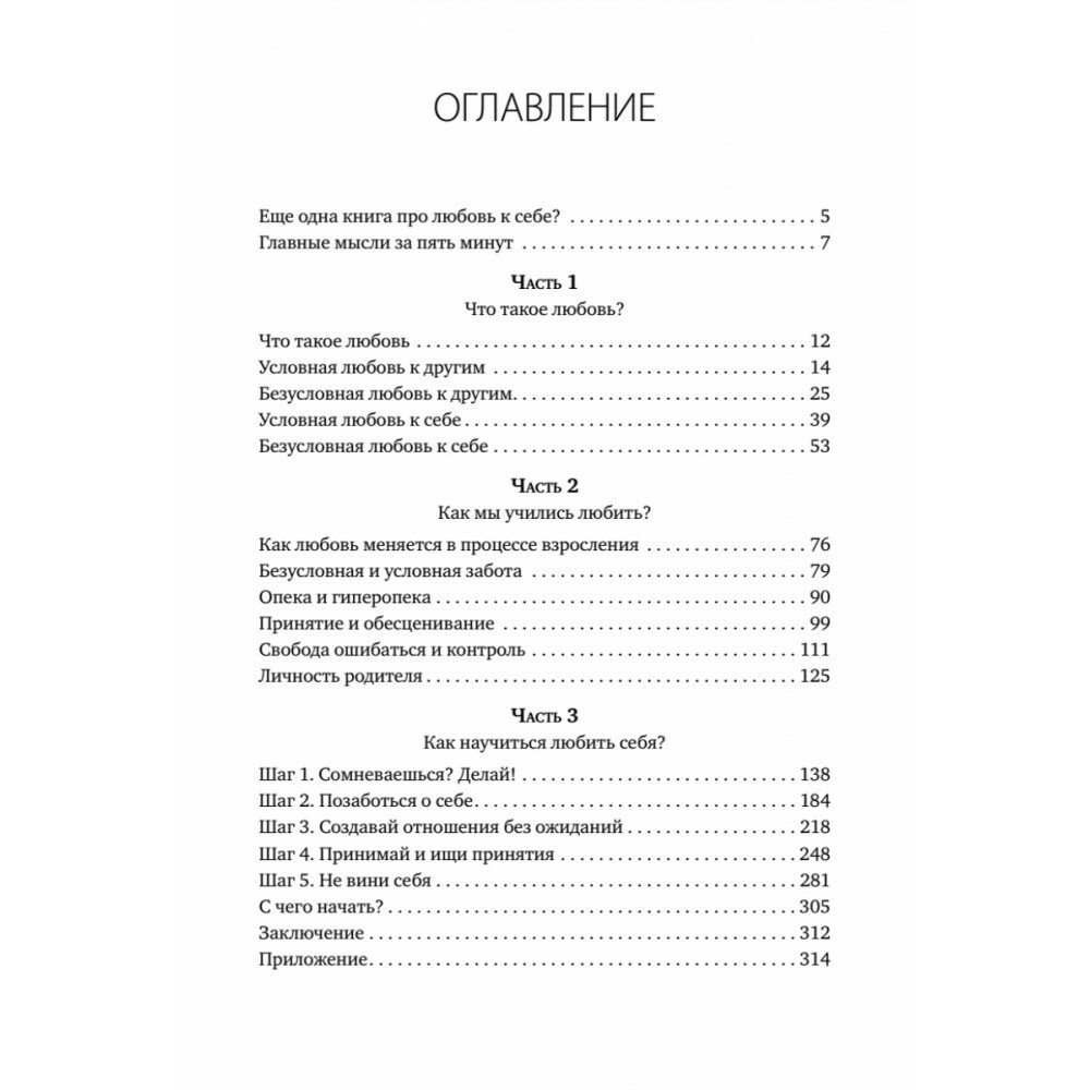 Потрясающая книга! В ней объясняются причины нелюбви к себе и даются практические советы, как ее развить. Для меня оказалось важным понимание, что мы сами можем давать себе эту любовь, а не должны ждать её со стороны, даже если другие люди нас любят. Помимо советов разбираются возражения, которые обычно нас останавливают, из разряда "это все здорово, но у меня так не получится". Это очень помогает решиться не оставлять всё как есть, а хотя бы попробовать что-то сделать. То есть книга даёт одновременно инструменты и поддержку. В общем, от души советую скорее прочитать и стать к себе добрее! Ну и еще круто, что книгу написал мой муж, а он знает, о чем говорит, потому что он чемпион безусловной любви) Так что это еще один аргумент за то, чтобы ее прочитать)